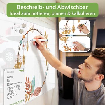 Die banjado Glas Magnettafel mit dem Motiv Motiv Boho Herbstkranz verbindet Funktionalität mit Stil. Sie ersetzt das Zettelchaos durch klare Strukturen und bringt dabei eine warme, natürliche Atmosphäre in Ihr Zuhause. Ob im Büro, in der Küche oder im Eingangsbereich - dieses Design-Board zieht Blicke an und sorgt für Ordnung mit Charakter.