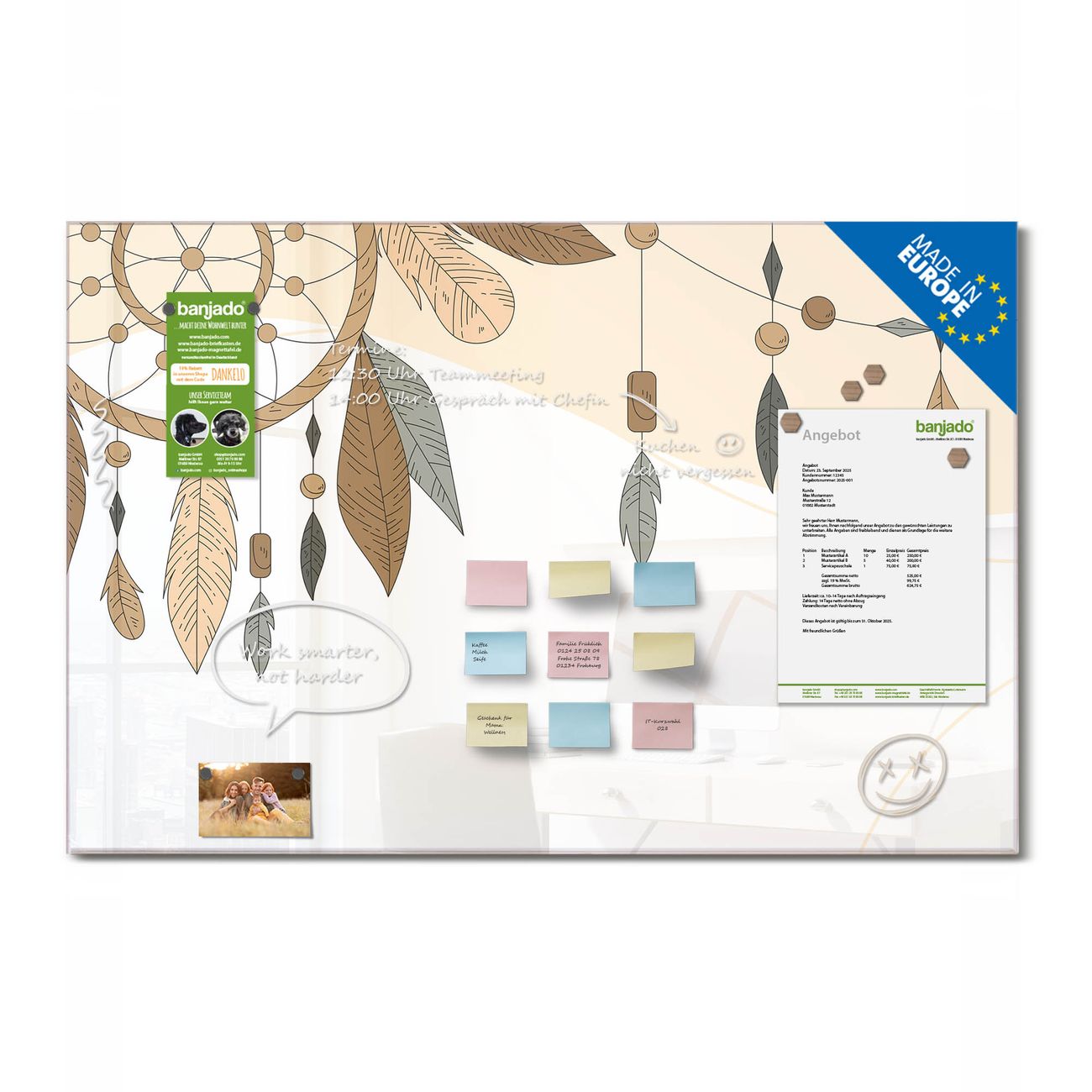 Ein Stück Design, das Ihren Alltag organisiert. Schreiben, heften, inspirieren - alles an einem Ort. Qualität, die man spürt. Montage leicht gemacht. Handwerk mit Herz - veredelt in Sachsen. Einzigartiges Design mit Motiv Motiv Boho Traumfänger Beschreibbare Glasoberfläche, leicht zu reinigen Starke Magnetkraft durch Stahlrückwand Inklusive 4 Neodym-Magneten Flexible Montageoptionen Handveredelt in Sachsen - Qualität, die bleibt