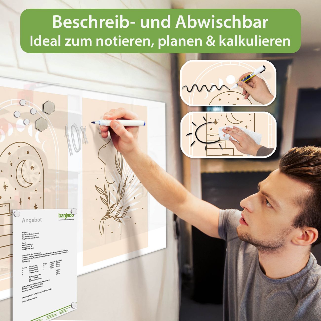 Jede Glas Magnettafel wird in unserer Werkstatt von Hand gefertigt und sorgfältig geprüft. So erhalten Sie ein echtes Qualitätsprodukt, das Funktion und Ästhetik perfekt vereint.?? Warum banjado?
