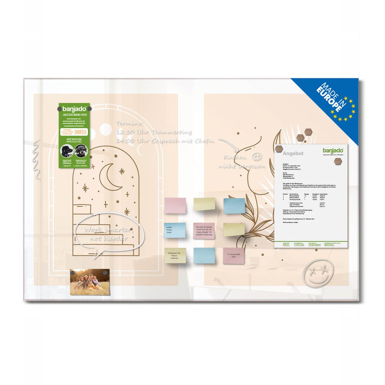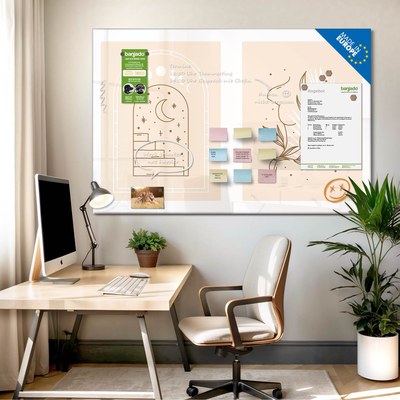 Jede Glas Magnettafel wird in unserer Werkstatt von Hand gefertigt und sorgfältig geprüft. So erhalten Sie ein echtes Qualitätsprodukt, das Funktion und Ästhetik perfekt vereint.?? Warum banjado?