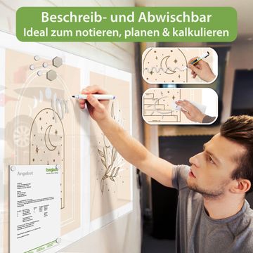 Auf der glatten Glasoberfläche lassen sich Termine, Rezepte oder Notizen ganz einfach mit Kreidestiften festhalten und rückstandslos entfernen. Starke Neodym-Magnete halten Ihre wichtigsten Erinnerungen sicher an Ort und Stelle. So entsteht Ihre ganz persönliche Ideenwand - jeden Tag neu.