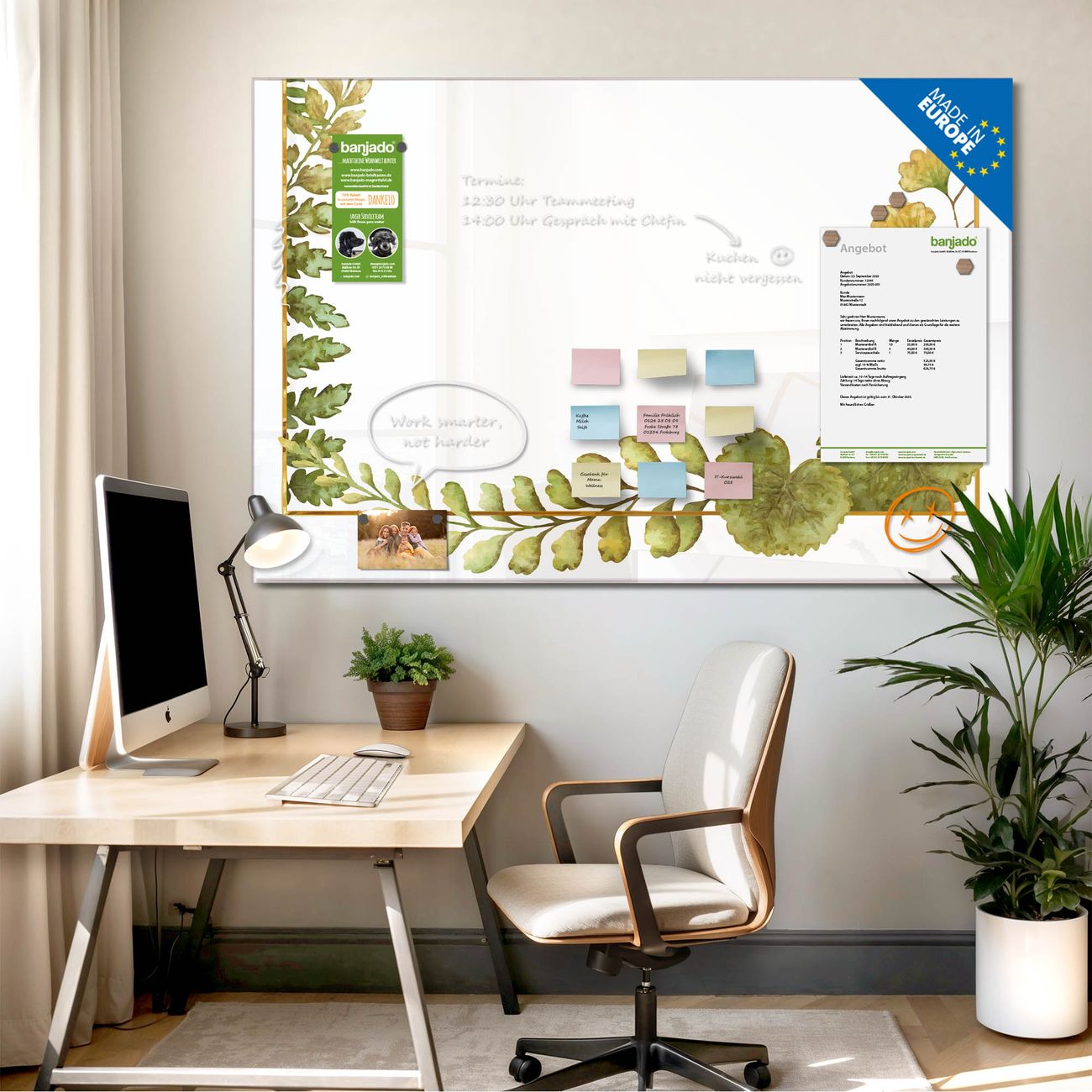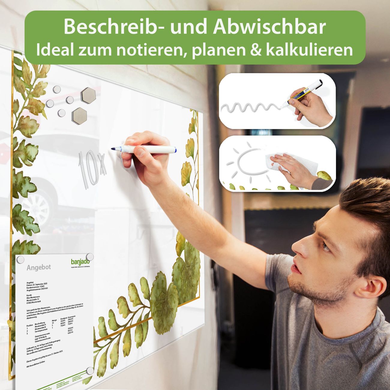 Die banjado Glas Magnettafel mit dem Motiv Motiv Botanischer Rahmen 2 verbindet Funktionalität mit Stil. Sie ersetzt das Zettelchaos durch klare Strukturen und bringt dabei eine warme, natürliche Atmosphäre in Ihr Zuhause. Ob im Büro, in der Küche oder im Eingangsbereich - dieses Design-Board zieht Blicke an und sorgt für Ordnung mit Charakter.