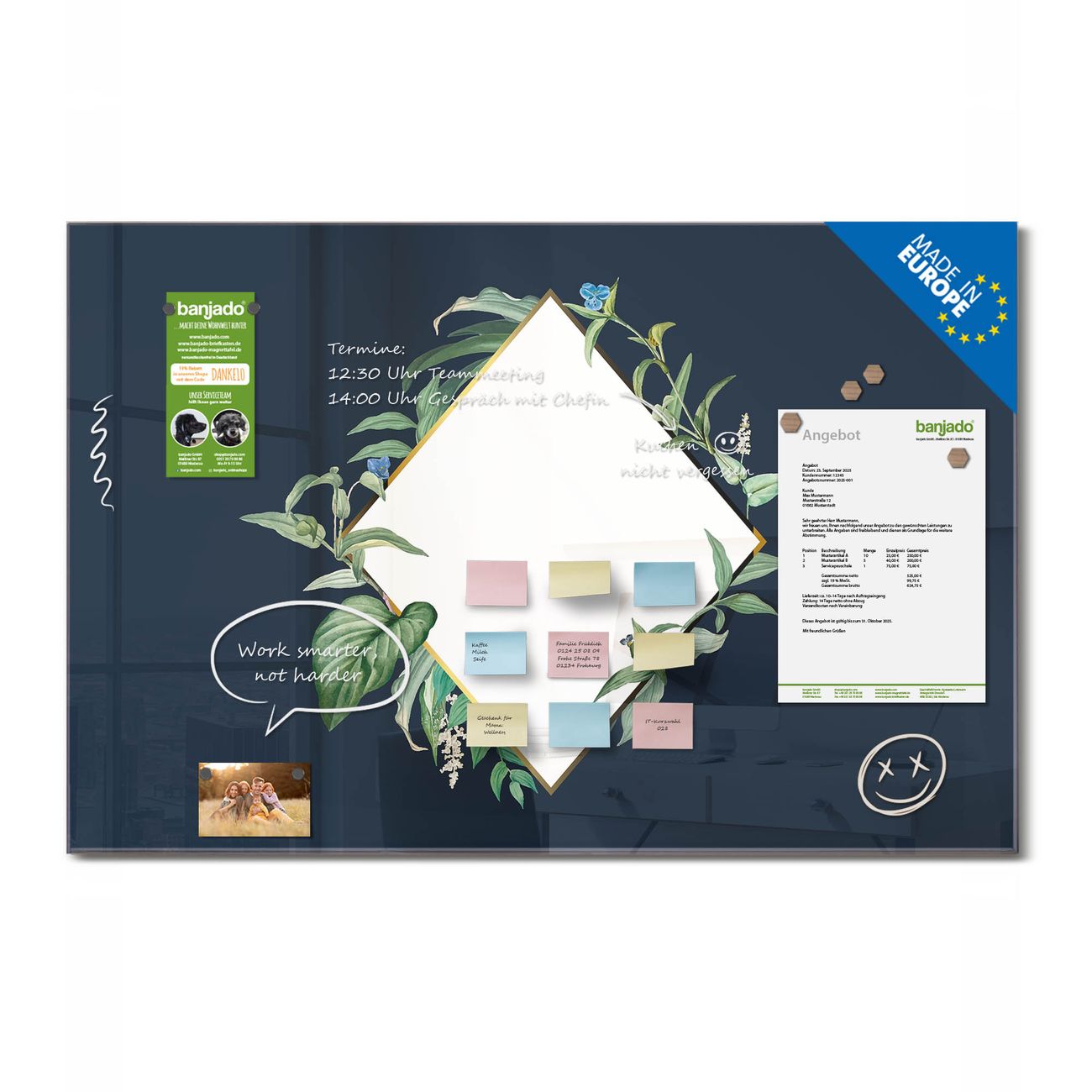 Jede Glas Magnettafel wird in unserer Werkstatt von Hand gefertigt und sorgfältig geprüft. So erhalten Sie ein echtes Qualitätsprodukt, das Funktion und Ästhetik perfekt vereint.?? Warum banjado?