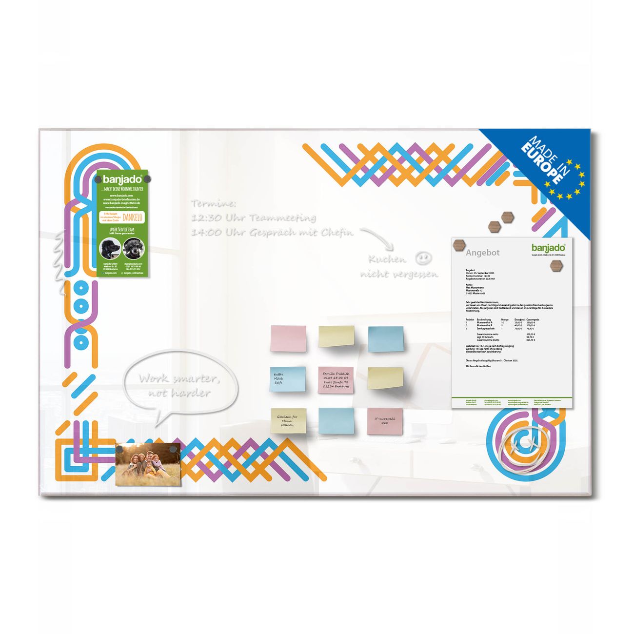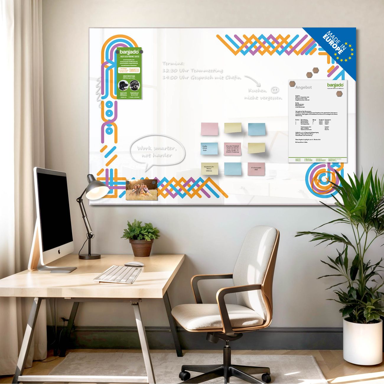 Jede Glas Magnettafel wird in unserer Werkstatt von Hand gefertigt und sorgfältig geprüft. So erhalten Sie ein echtes Qualitätsprodukt, das Funktion und Ästhetik perfekt vereint.?? Warum banjado?