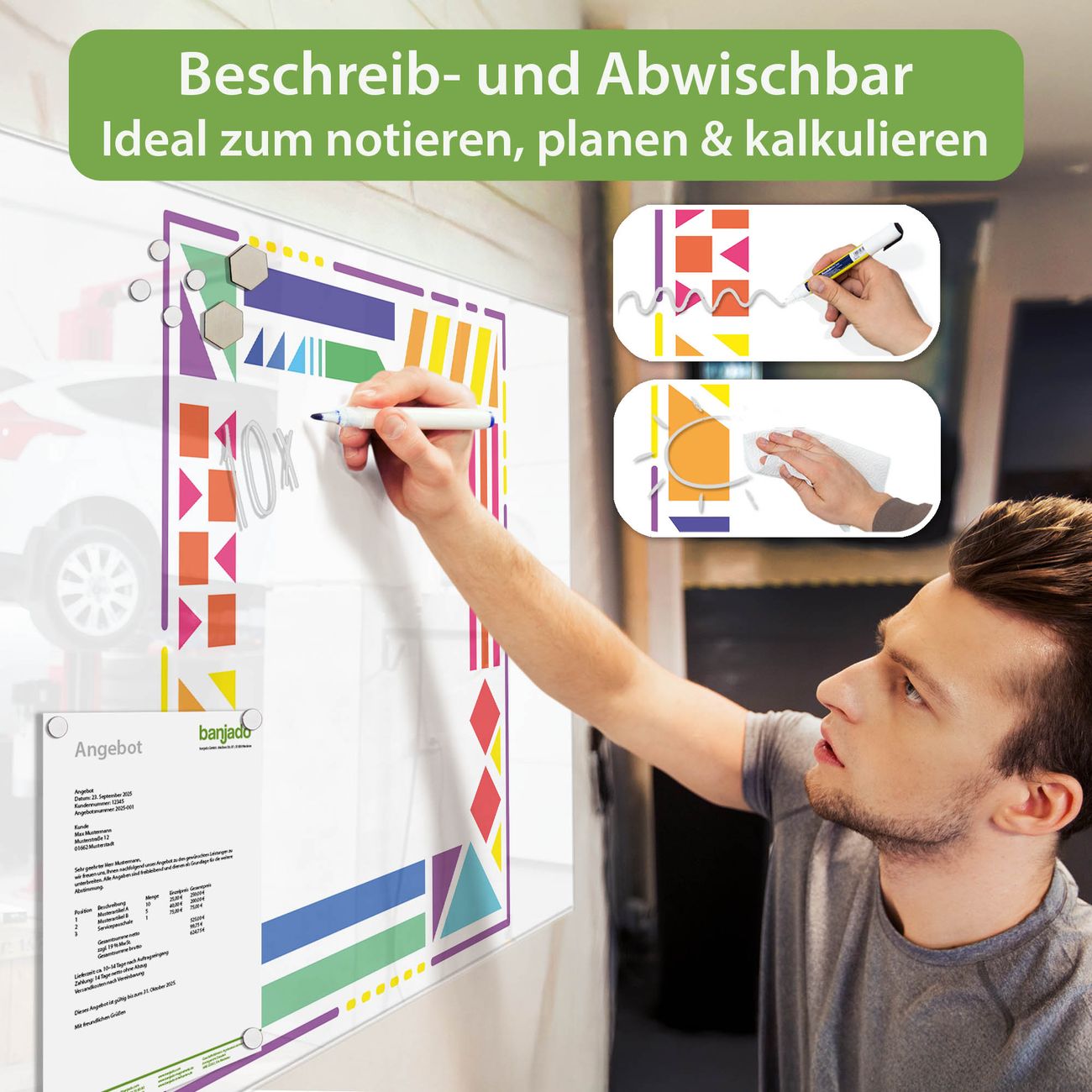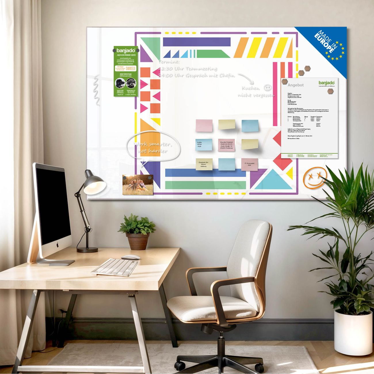 Jede Glas Magnettafel wird in unserer Werkstatt von Hand gefertigt und sorgfältig geprüft. So erhalten Sie ein echtes Qualitätsprodukt, das Funktion und Ästhetik perfekt vereint.?? Warum banjado?