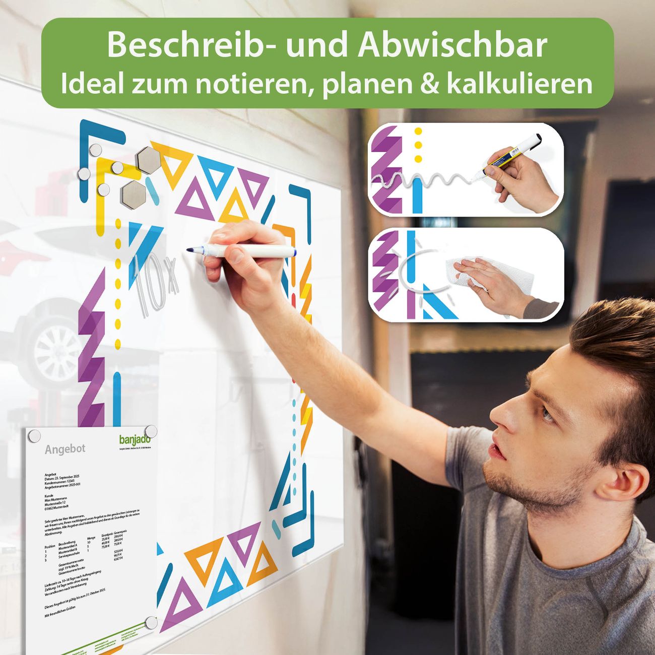 Die banjado Glas Magnettafel mit dem Motiv Motiv Bunter Geometrischer Rahmen verbindet Funktionalität mit Stil. Sie ersetzt das Zettelchaos durch klare Strukturen und bringt dabei eine warme, natürliche Atmosphäre in Ihr Zuhause. Ob im Büro, in der Küche oder im Eingangsbereich - dieses Design-Board zieht Blicke an und sorgt für Ordnung mit Charakter.