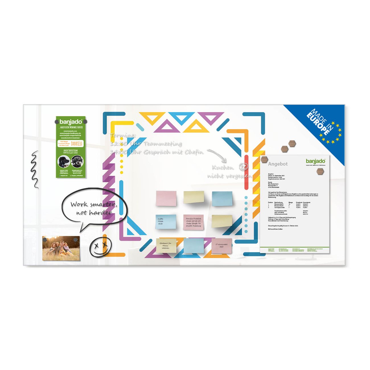 Ein Stück Design, das Ihren Alltag organisiert. Schreiben, heften, inspirieren - alles an einem Ort. Qualität, die man spürt. Montage leicht gemacht. Handwerk mit Herz - veredelt in Sachsen. Einzigartiges Design mit Motiv Motiv Bunter Geometrischer Rahmen Beschreibbare Glasoberfläche, leicht zu reinigen Starke Magnetkraft durch Stahlrückwand Inklusive 4 Neodym-Magneten Flexible Montageoptionen Handveredelt in Sachsen - Qualität, die bleibt