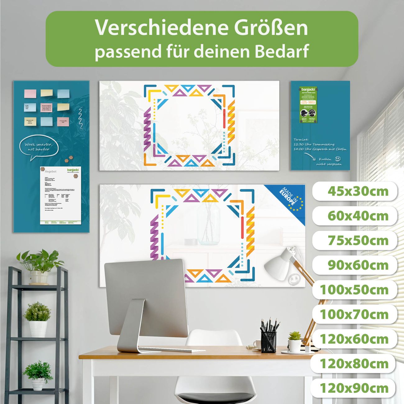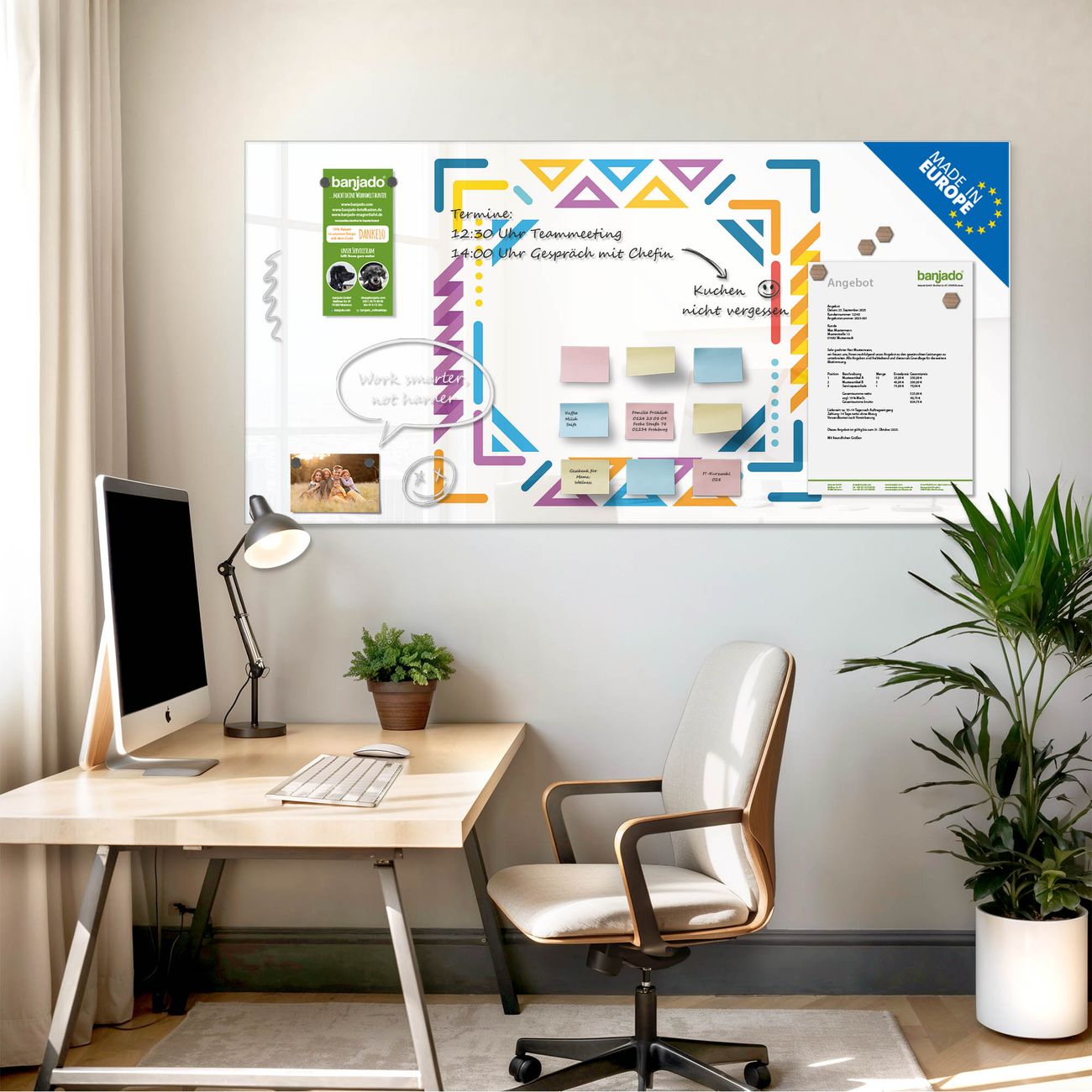 Jede Glas Magnettafel wird in unserer Werkstatt von Hand gefertigt und sorgfältig geprüft. So erhalten Sie ein echtes Qualitätsprodukt, das Funktion und Ästhetik perfekt vereint.?? Warum banjado?