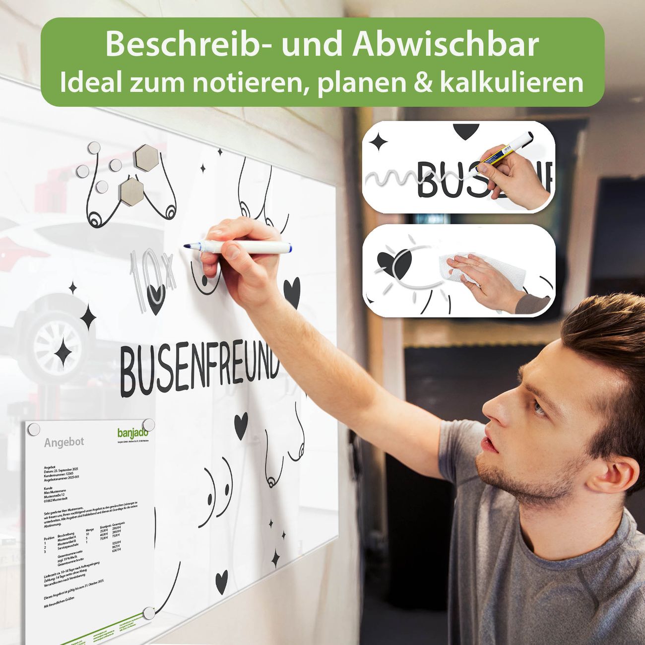 Jede Glas Magnettafel wird in unserer Werkstatt von Hand gefertigt und sorgfältig geprüft. So erhalten Sie ein echtes Qualitätsprodukt, das Funktion und Ästhetik perfekt vereint.?? Warum banjado?