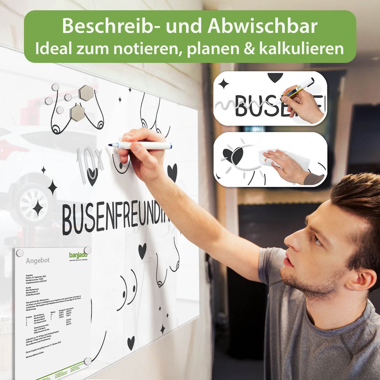 Jede Glas Magnettafel wird in unserer Werkstatt von Hand gefertigt und sorgfältig geprüft. So erhalten Sie ein echtes Qualitätsprodukt, das Funktion und Ästhetik perfekt vereint.?? Warum banjado?