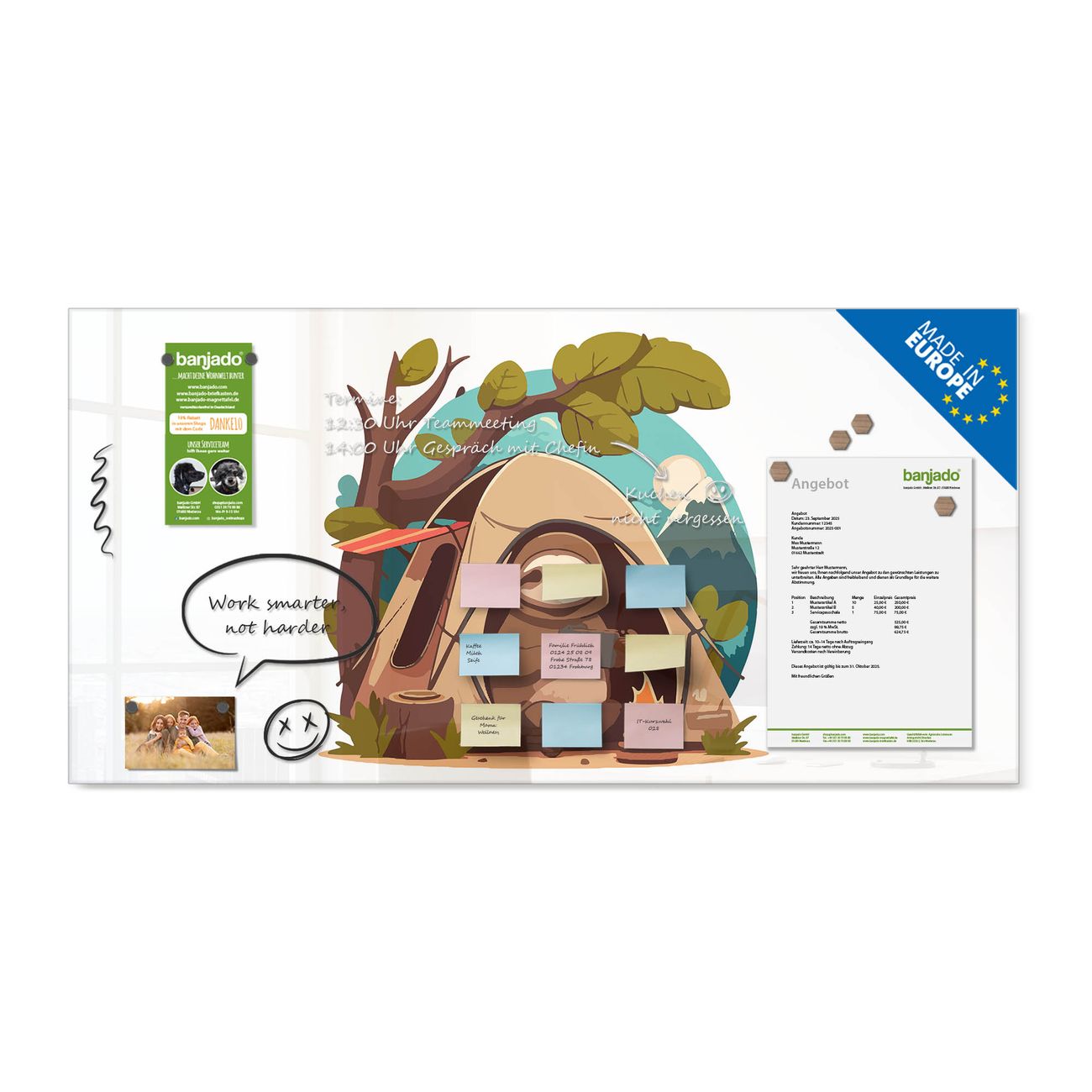 Die banjado Glas Magnettafel mit dem Motiv Motiv Camping mit Faultier verbindet Funktionalität mit Stil. Sie ersetzt das Zettelchaos durch klare Strukturen und bringt dabei eine warme, natürliche Atmosphäre in Ihr Zuhause. Ob im Büro, in der Küche oder im Eingangsbereich - dieses Design-Board zieht Blicke an und sorgt für Ordnung mit Charakter.