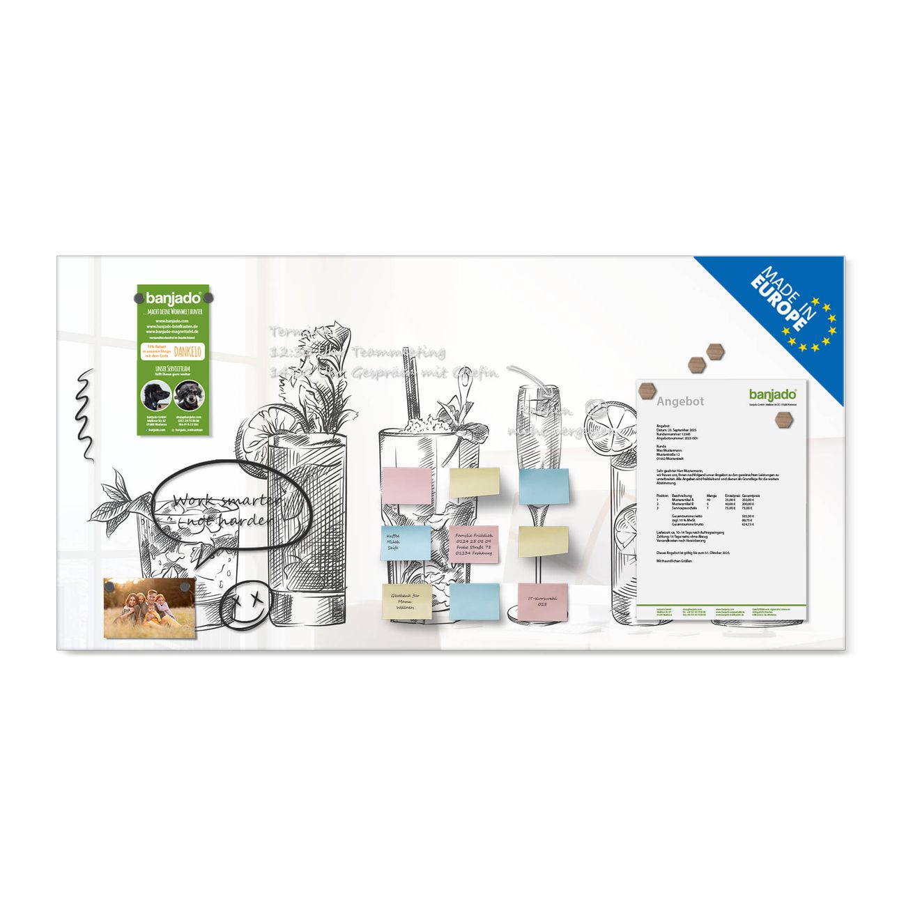 Jede Glas Magnettafel wird in unserer Werkstatt von Hand gefertigt und sorgfältig geprüft. So erhalten Sie ein echtes Qualitätsprodukt, das Funktion und Ästhetik perfekt vereint.?? Warum banjado?