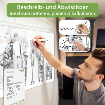 Auf der glatten Glasoberfläche lassen sich Termine, Rezepte oder Notizen ganz einfach mit Kreidestiften festhalten und rückstandslos entfernen. Starke Neodym-Magnete halten Ihre wichtigsten Erinnerungen sicher an Ort und Stelle. So entsteht Ihre ganz persönliche Ideenwand - jeden Tag neu.