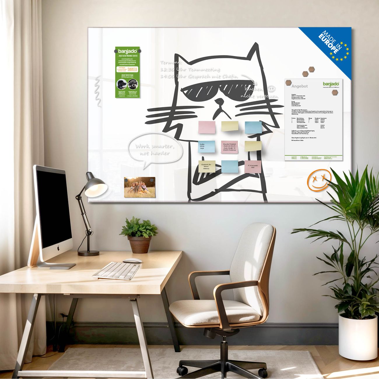 Die banjado Glas Magnettafel mit dem Motiv Motiv Coole Katze verbindet Funktionalität mit Stil. Sie ersetzt das Zettelchaos durch klare Strukturen und bringt dabei eine warme, natürliche Atmosphäre in Ihr Zuhause. Ob im Büro, in der Küche oder im Eingangsbereich - dieses Design-Board zieht Blicke an und sorgt für Ordnung mit Charakter.