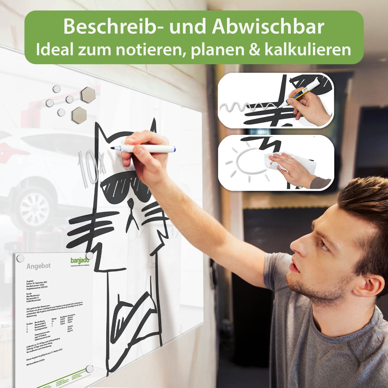 Bitte beachten Sie, dass ausschliessliche spezielle Magnete an der Glastafel haften. Wir empfehlen banjado Neodym Magnete, diese sind durch uns auf Wirksamkeit geprüft.