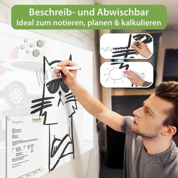 Auf der glatten Glasoberfläche lassen sich Termine, Rezepte oder Notizen ganz einfach mit Kreidestiften festhalten und rückstandslos entfernen. Starke Neodym-Magnete halten Ihre wichtigsten Erinnerungen sicher an Ort und Stelle. So entsteht Ihre ganz persönliche Ideenwand - jeden Tag neu.