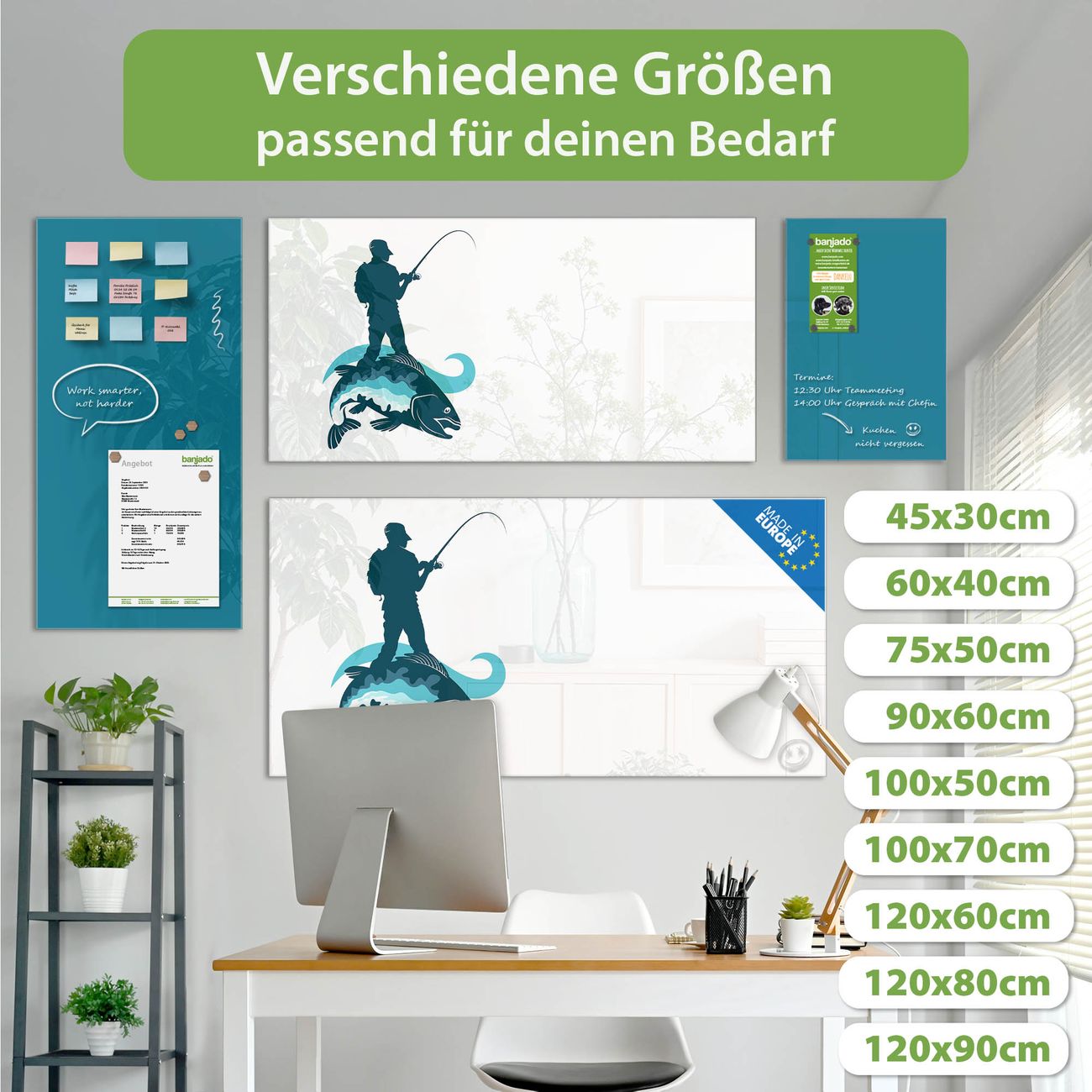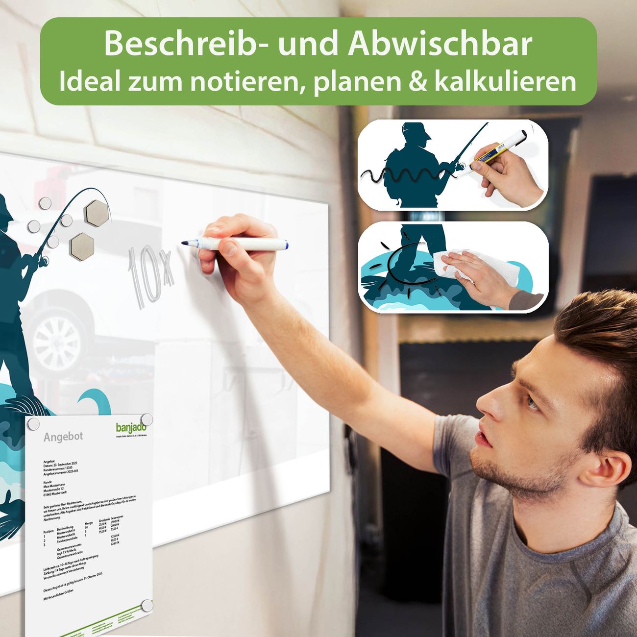 Jede Glas Magnettafel wird in unserer Werkstatt von Hand gefertigt und sorgfältig geprüft. So erhalten Sie ein echtes Qualitätsprodukt, das Funktion und Ästhetik perfekt vereint.?? Warum banjado?