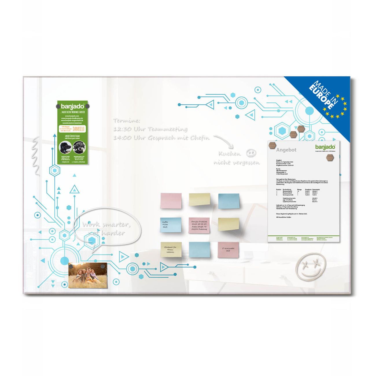 Jede Glas Magnettafel wird in unserer Werkstatt von Hand gefertigt und sorgfältig geprüft. So erhalten Sie ein echtes Qualitätsprodukt, das Funktion und Ästhetik perfekt vereint.?? Warum banjado?