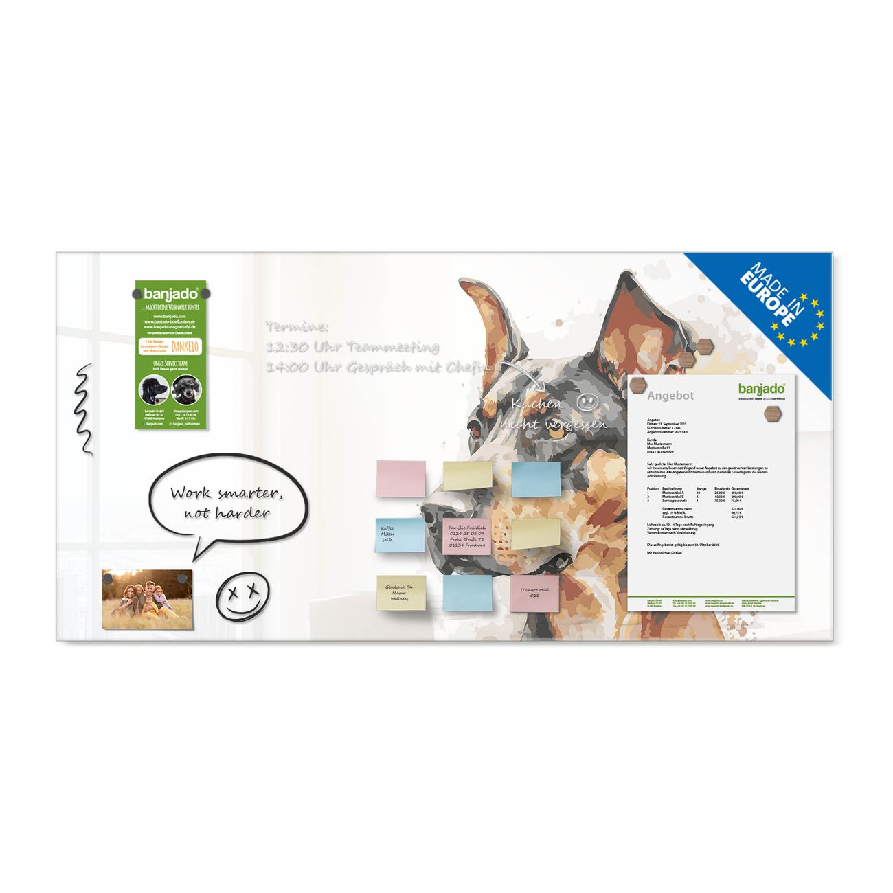 Ein Stück Design, das Ihren Alltag organisiert. Schreiben, heften, inspirieren - alles an einem Ort. Qualität, die man spürt. Montage leicht gemacht. Handwerk mit Herz - veredelt in Sachsen. Einzigartiges Design mit Motiv Motiv Dobermann-Portrait Beschreibbare Glasoberfläche, leicht zu reinigen Starke Magnetkraft durch Stahlrückwand Inklusive 4 Neodym-Magneten Flexible Montageoptionen Handveredelt in Sachsen - Qualität, die bleibt