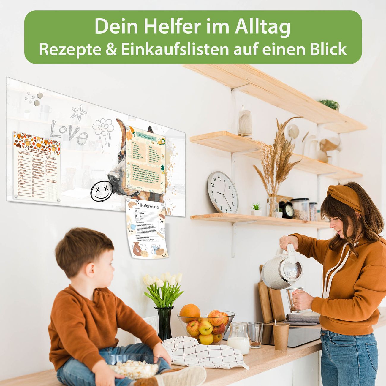 Auf der glatten Glasoberfläche lassen sich Termine, Rezepte oder Notizen ganz einfach mit Kreidestiften festhalten und rückstandslos entfernen. Starke Neodym-Magnete halten Ihre wichtigsten Erinnerungen sicher an Ort und Stelle. So entsteht Ihre ganz persönliche Ideenwand - jeden Tag neu.