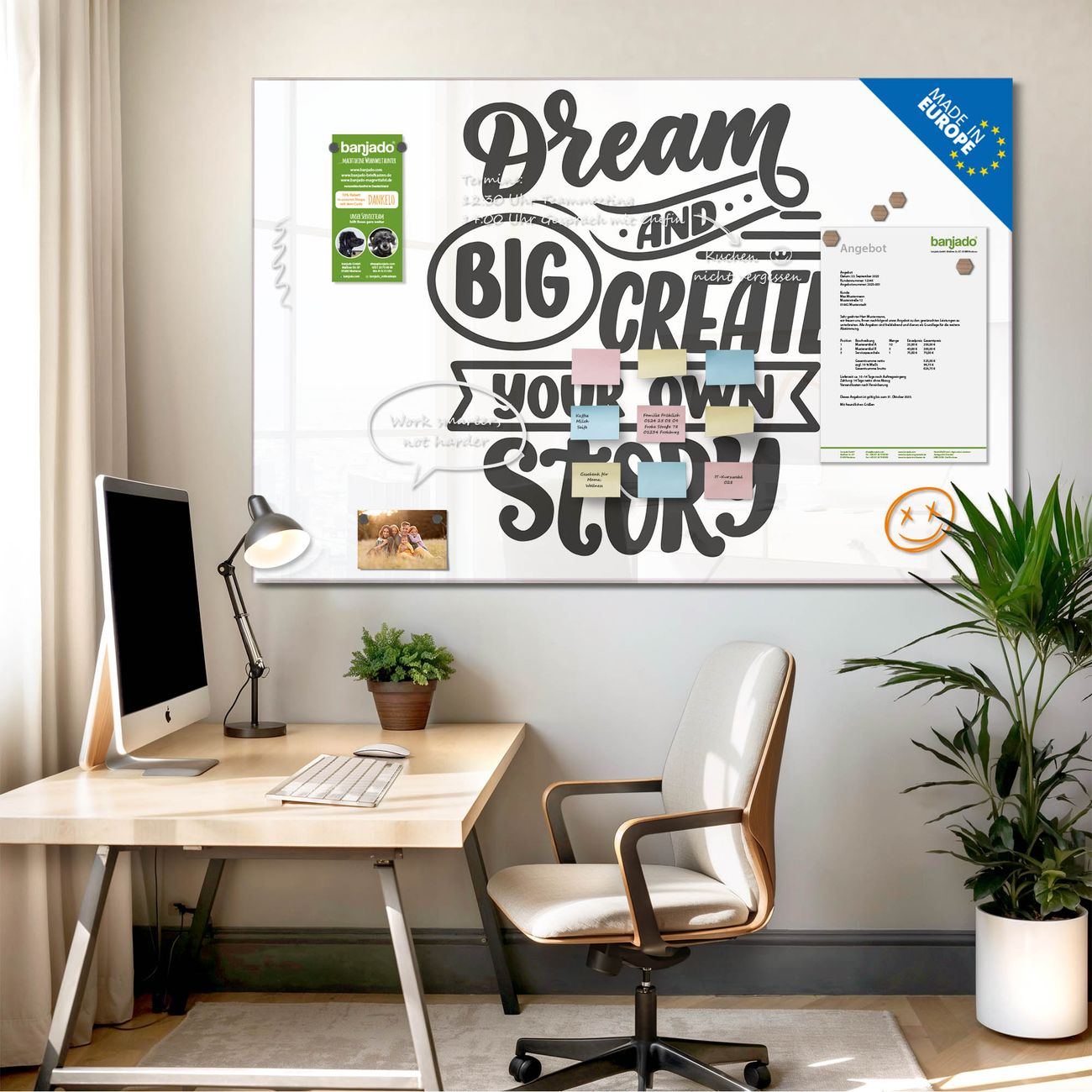 Die banjado Glas Magnettafel mit dem Motiv Motiv Dream Big 2 verbindet Funktionalität mit Stil. Sie ersetzt das Zettelchaos durch klare Strukturen und bringt dabei eine warme, natürliche Atmosphäre in Ihr Zuhause. Ob im Büro, in der Küche oder im Eingangsbereich - dieses Design-Board zieht Blicke an und sorgt für Ordnung mit Charakter.
