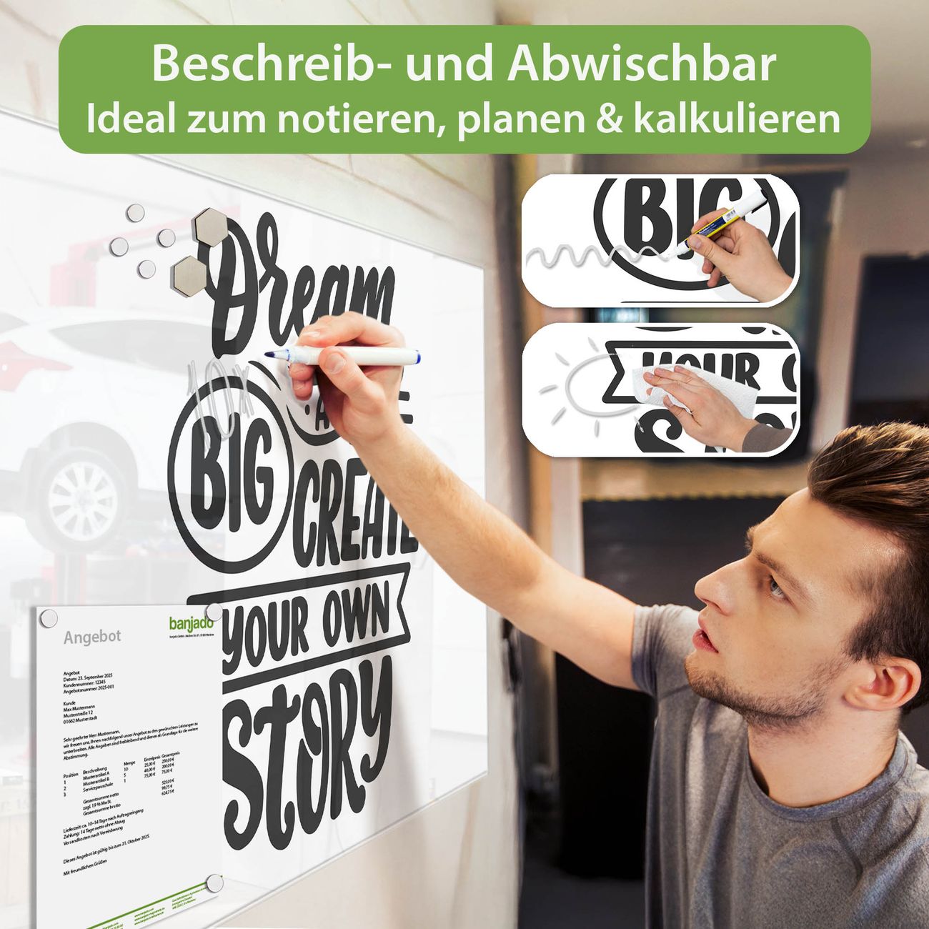 Jede Glas Magnettafel wird in unserer Werkstatt von Hand gefertigt und sorgfältig geprüft. So erhalten Sie ein echtes Qualitätsprodukt, das Funktion und Ästhetik perfekt vereint.?? Warum banjado?