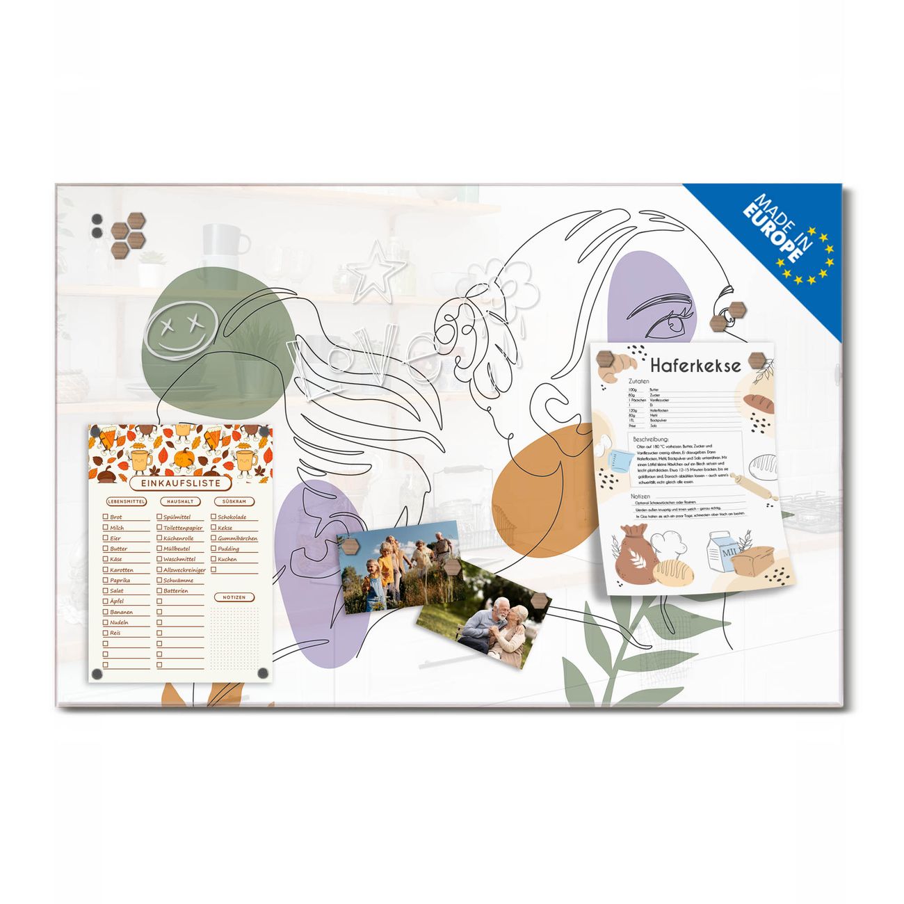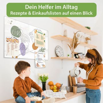 Auf der glatten Glasoberfläche lassen sich Termine, Rezepte oder Notizen ganz einfach mit Kreidestiften festhalten und rückstandslos entfernen. Starke Neodym-Magnete halten Ihre wichtigsten Erinnerungen sicher an Ort und Stelle. So entsteht Ihre ganz persönliche Ideenwand - jeden Tag neu.
