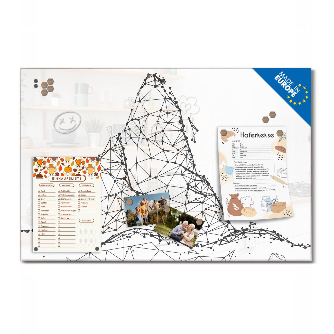 Auf der glatten Glasoberfläche lassen sich Termine, Rezepte oder Notizen ganz einfach mit Kreidestiften festhalten und rückstandslos entfernen. Starke Neodym-Magnete halten Ihre wichtigsten Erinnerungen sicher an Ort und Stelle. So entsteht Ihre ganz persönliche Ideenwand - jeden Tag neu.