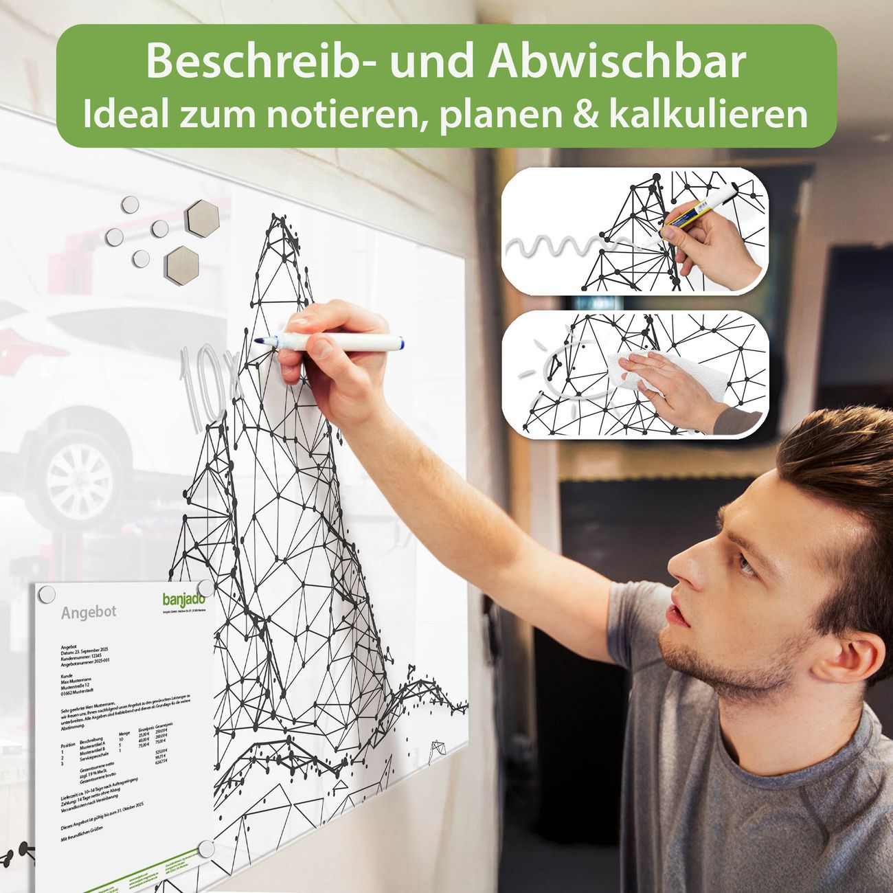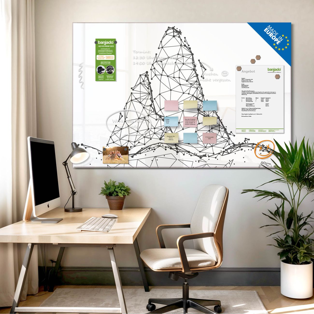 Jede Glas Magnettafel wird in unserer Werkstatt von Hand gefertigt und sorgfältig geprüft. So erhalten Sie ein echtes Qualitätsprodukt, das Funktion und Ästhetik perfekt vereint.?? Warum banjado?