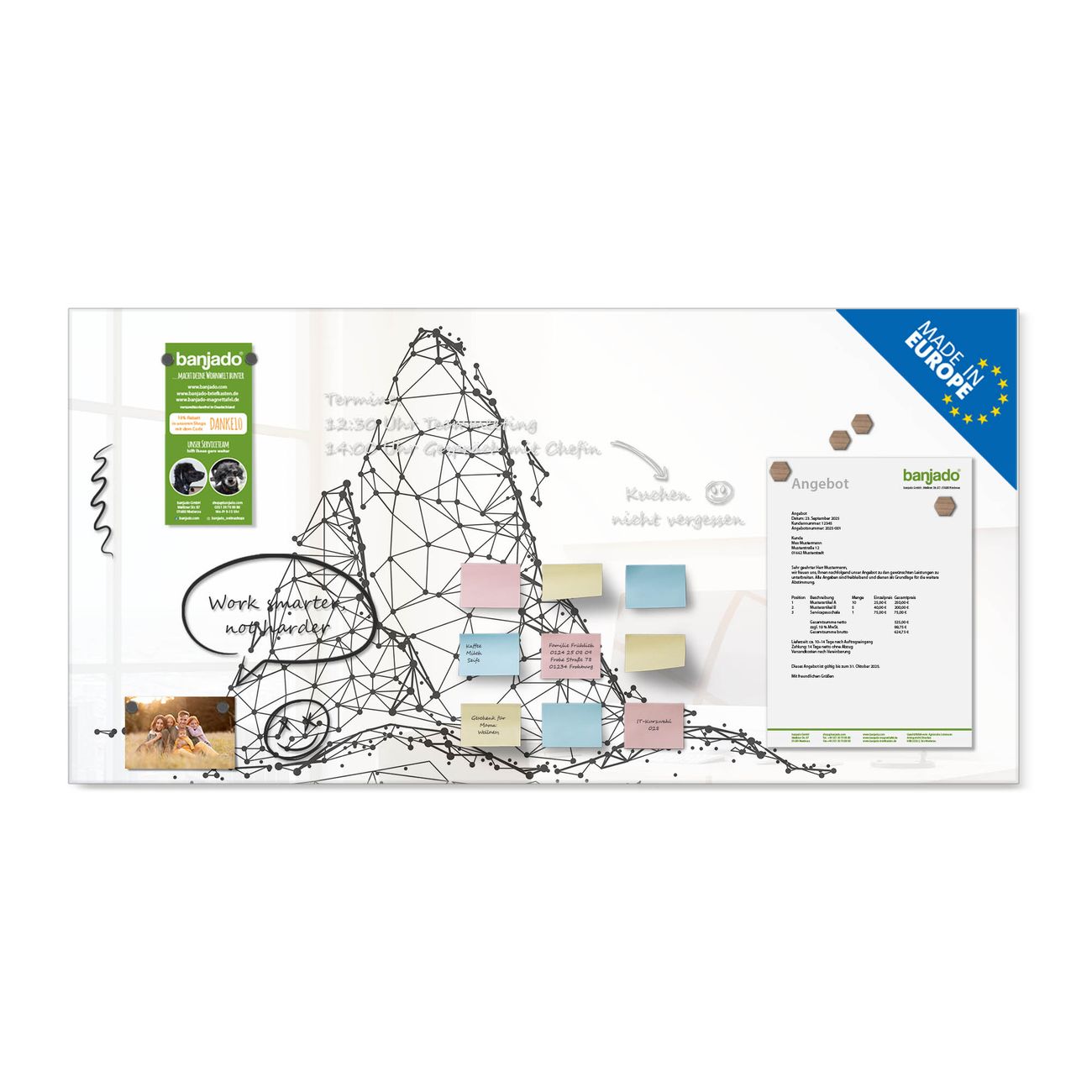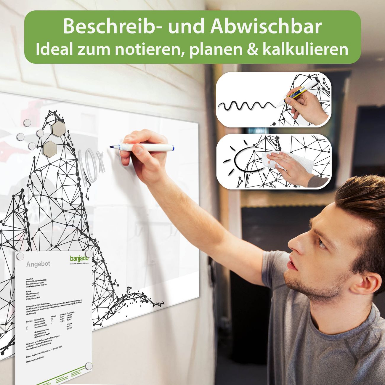 Jede Glas Magnettafel wird in unserer Werkstatt von Hand gefertigt und sorgfältig geprüft. So erhalten Sie ein echtes Qualitätsprodukt, das Funktion und Ästhetik perfekt vereint.?? Warum banjado?