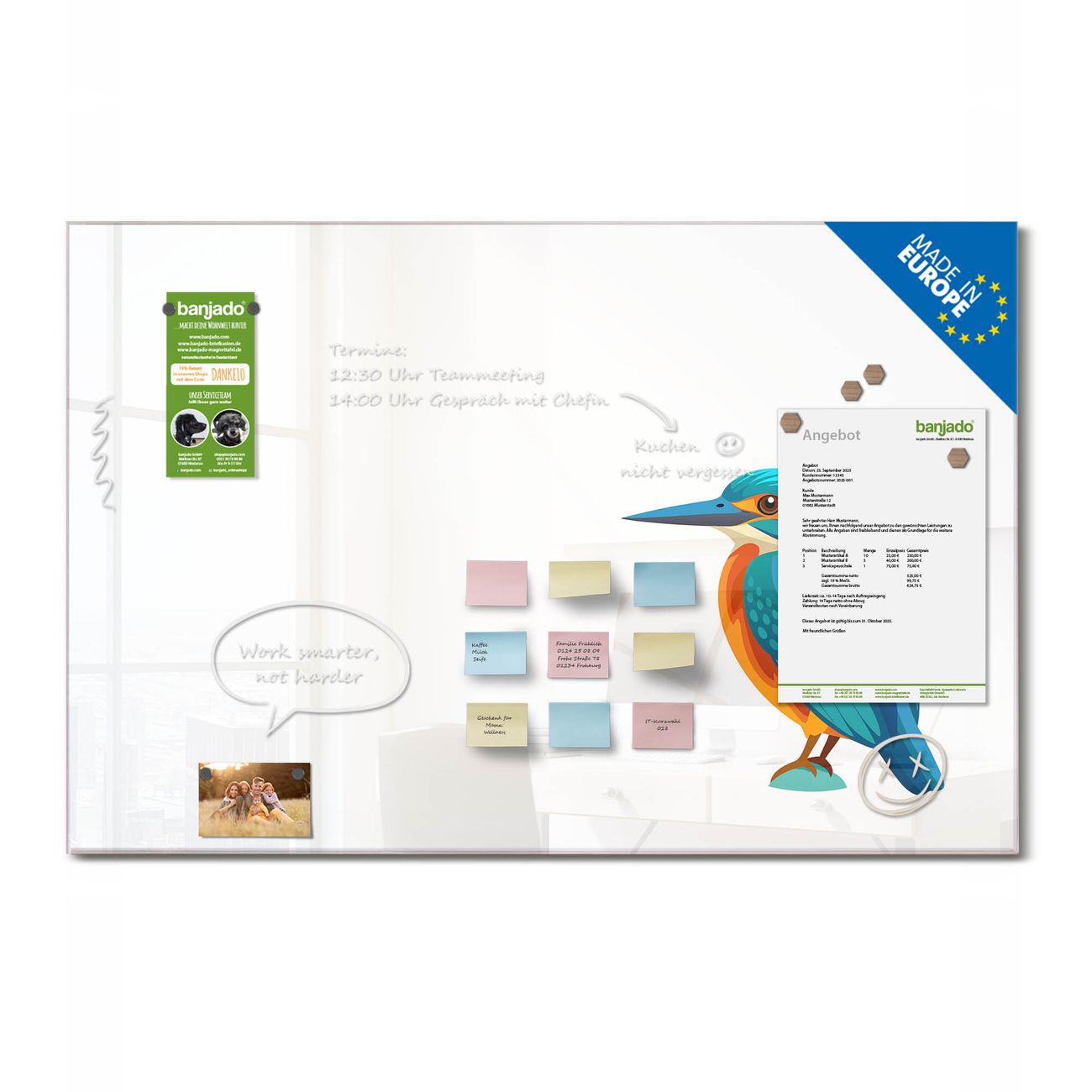 Jede Glas Magnettafel wird in unserer Werkstatt von Hand gefertigt und sorgfältig geprüft. So erhalten Sie ein echtes Qualitätsprodukt, das Funktion und Ästhetik perfekt vereint.?? Warum banjado?