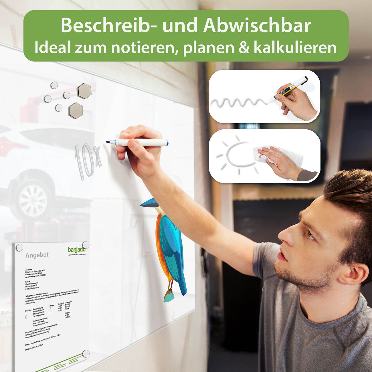 Bitte beachten Sie, dass ausschliessliche spezielle Magnete an der Glastafel haften. Wir empfehlen banjado Neodym Magnete, diese sind durch uns auf Wirksamkeit geprüft.