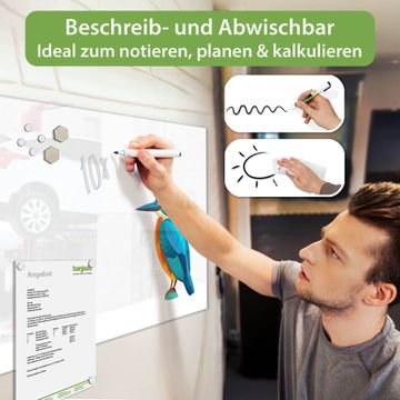 Auf der glatten Glasoberfläche lassen sich Termine, Rezepte oder Notizen ganz einfach mit Kreidestiften festhalten und rückstandslos entfernen. Starke Neodym-Magnete halten Ihre wichtigsten Erinnerungen sicher an Ort und Stelle. So entsteht Ihre ganz persönliche Ideenwand - jeden Tag neu.