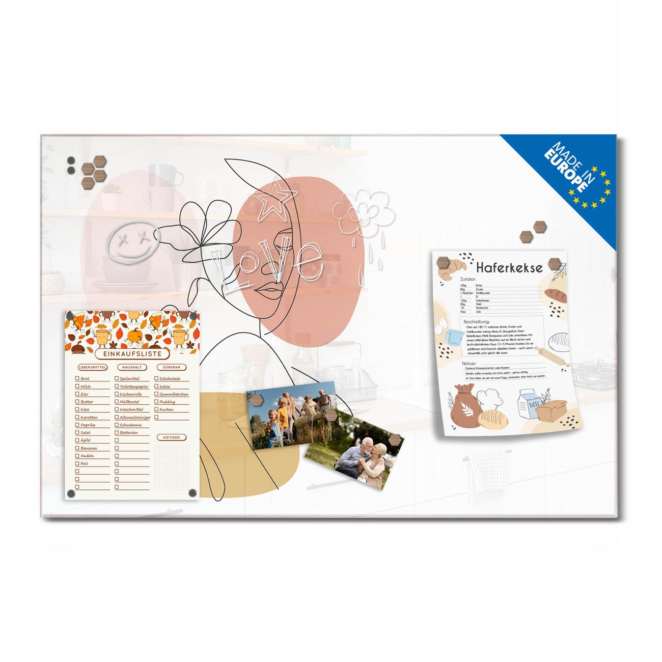 Auf der glatten Glasoberfläche lassen sich Termine, Rezepte oder Notizen ganz einfach mit Kreidestiften festhalten und rückstandslos entfernen. Starke Neodym-Magnete halten Ihre wichtigsten Erinnerungen sicher an Ort und Stelle. So entsteht Ihre ganz persönliche Ideenwand - jeden Tag neu.