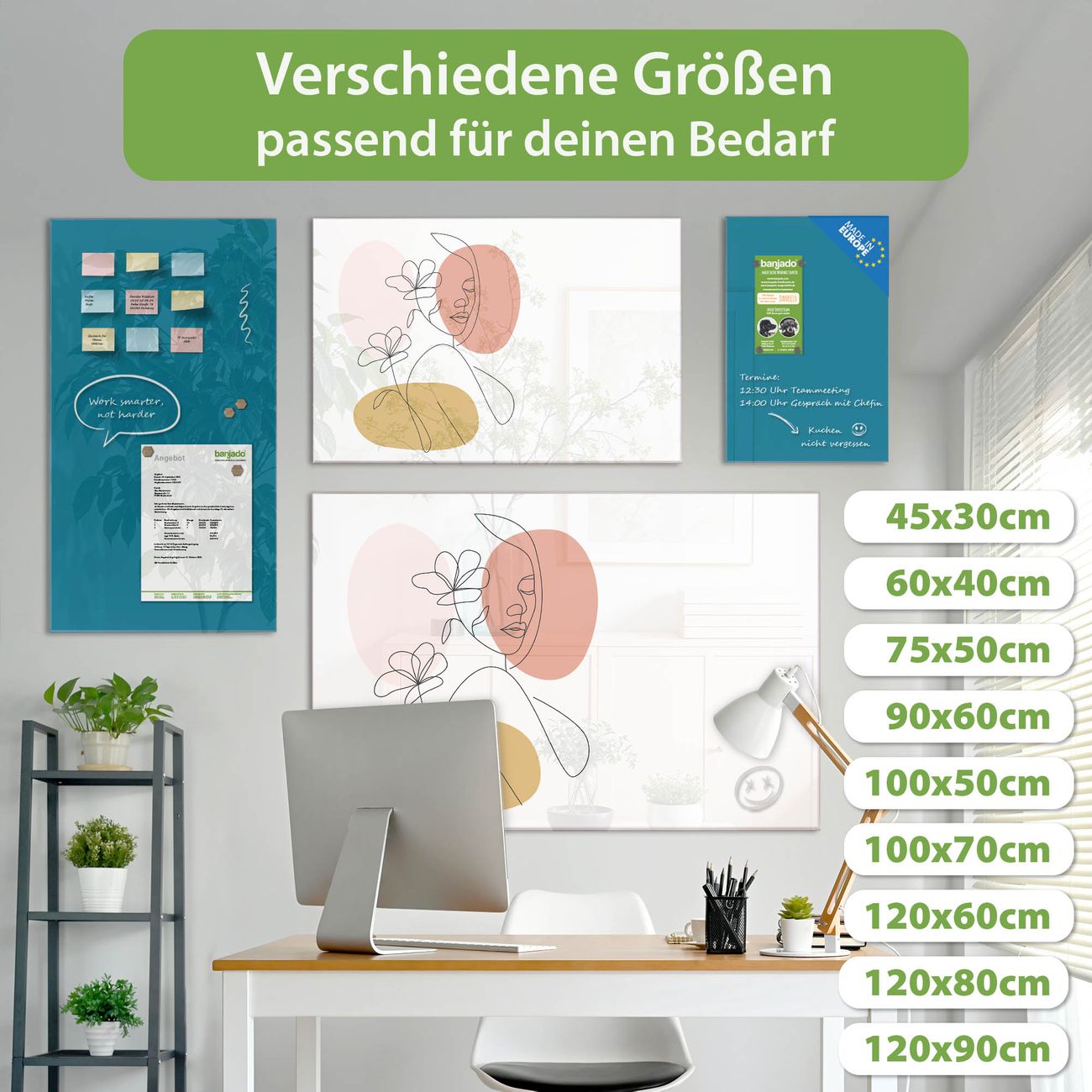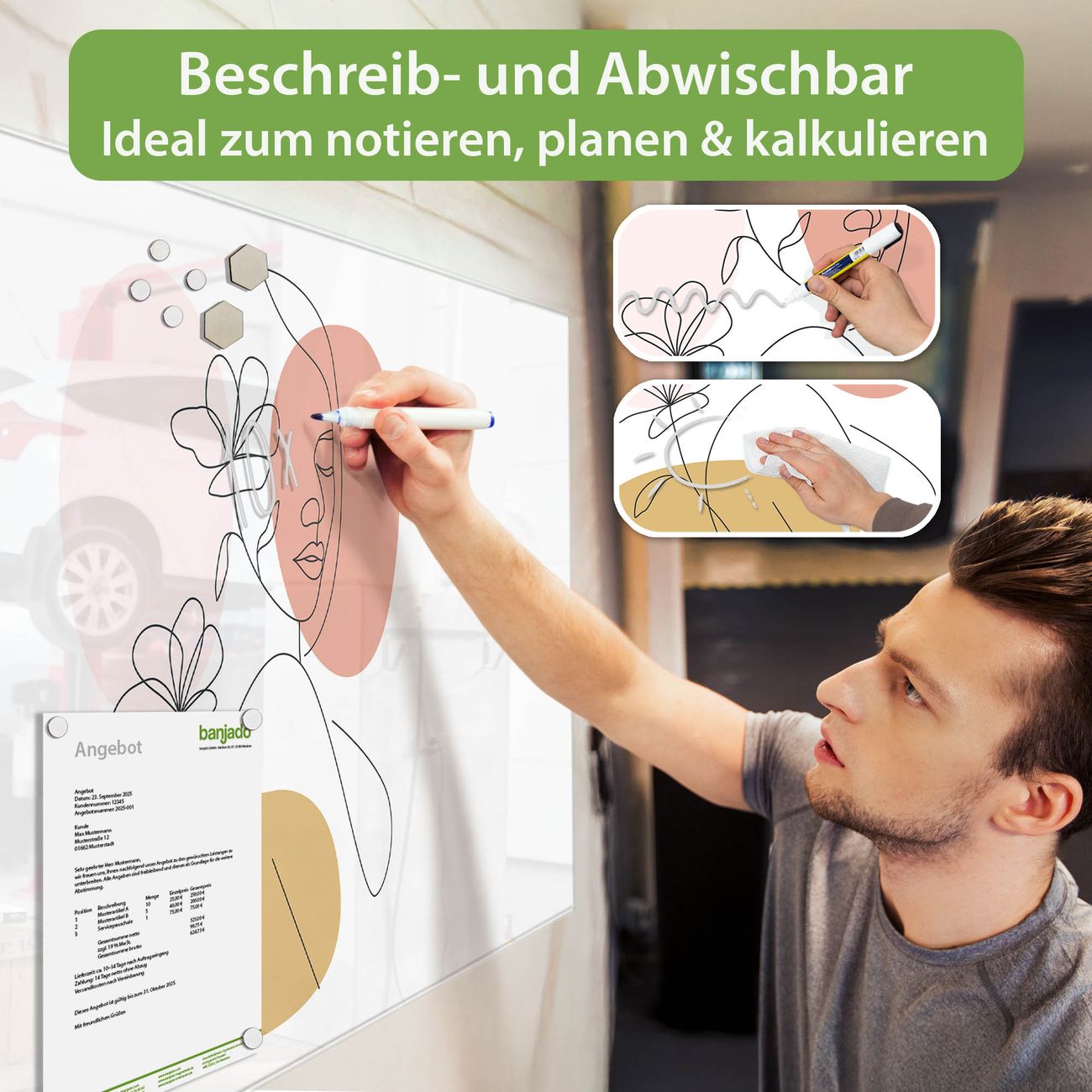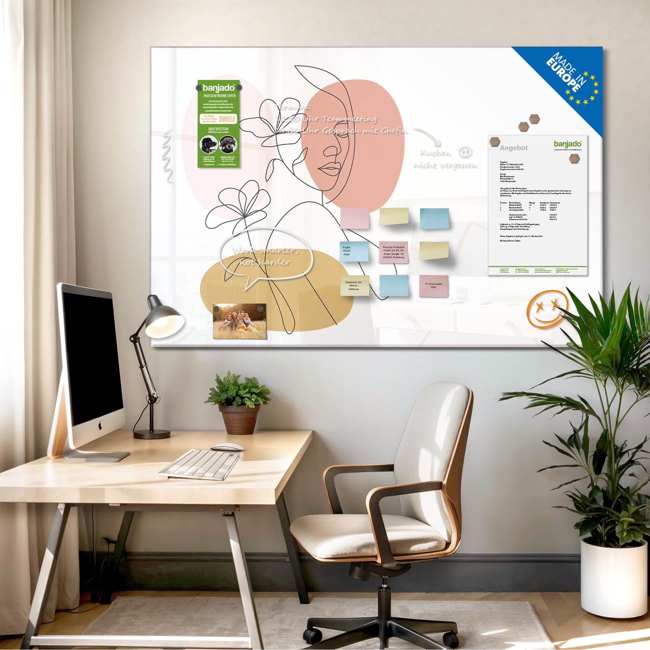 Jede Glas Magnettafel wird in unserer Werkstatt von Hand gefertigt und sorgfältig geprüft. So erhalten Sie ein echtes Qualitätsprodukt, das Funktion und Ästhetik perfekt vereint.?? Warum banjado?