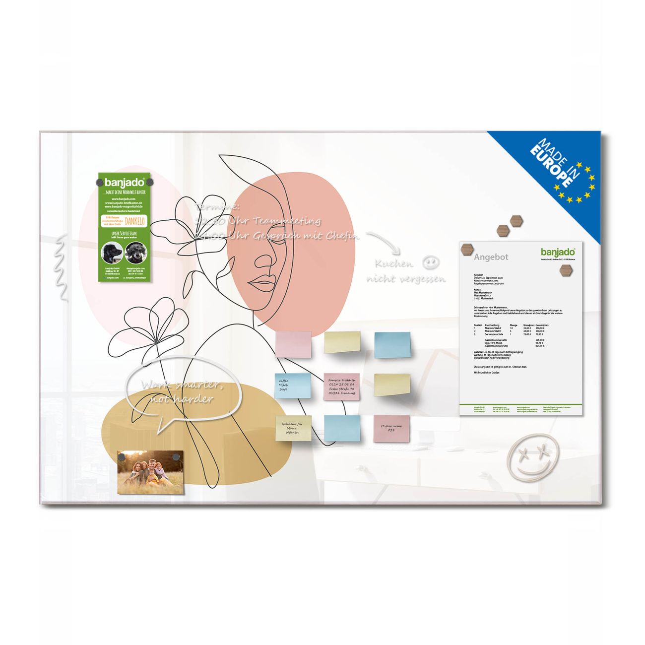 Jede Glas Magnettafel wird in unserer Werkstatt von Hand gefertigt und sorgfältig geprüft. So erhalten Sie ein echtes Qualitätsprodukt, das Funktion und Ästhetik perfekt vereint.?? Warum banjado?