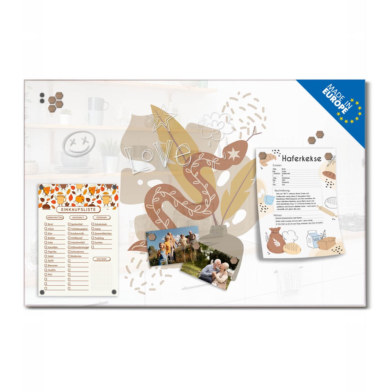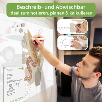 Auf der glatten Glasoberfläche lassen sich Termine, Rezepte oder Notizen ganz einfach mit Kreidestiften festhalten und rückstandslos entfernen. Starke Neodym-Magnete halten Ihre wichtigsten Erinnerungen sicher an Ort und Stelle. So entsteht Ihre ganz persönliche Ideenwand - jeden Tag neu.