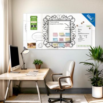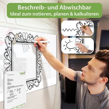 Auf der glatten Glasoberfläche lassen sich Termine, Rezepte oder Notizen ganz einfach mit Kreidestiften festhalten und rückstandslos entfernen. Starke Neodym-Magnete halten Ihre wichtigsten Erinnerungen sicher an Ort und Stelle. So entsteht Ihre ganz persönliche Ideenwand - jeden Tag neu.