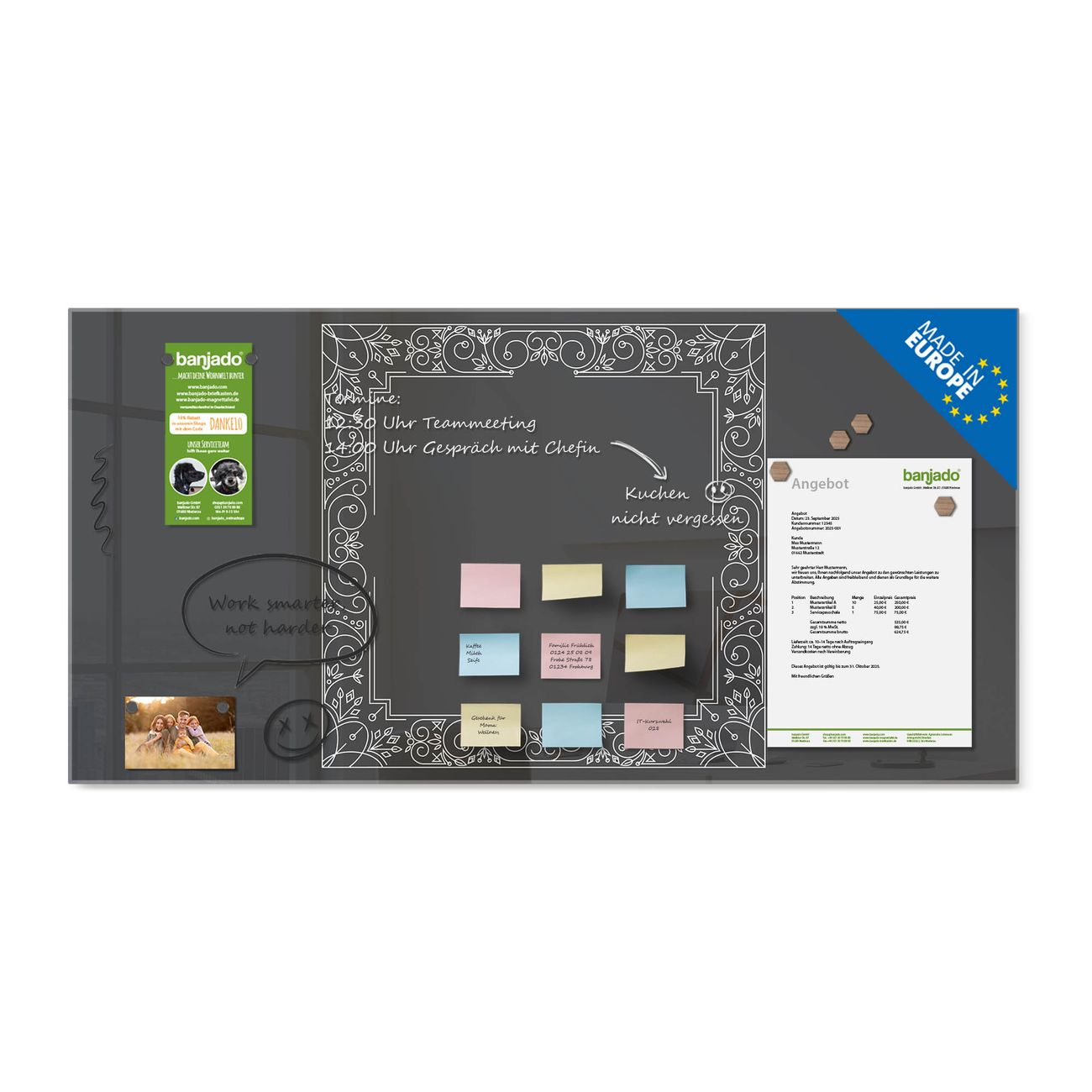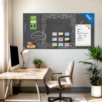 Auf der glatten Glasoberfläche lassen sich Termine, Rezepte oder Notizen ganz einfach mit Kreidestiften festhalten und rückstandslos entfernen. Starke Neodym-Magnete halten Ihre wichtigsten Erinnerungen sicher an Ort und Stelle. So entsteht Ihre ganz persönliche Ideenwand - jeden Tag neu.