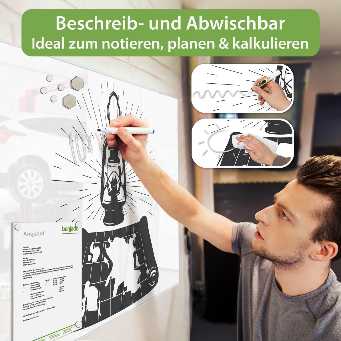 Jede Glas Magnettafel wird in unserer Werkstatt von Hand gefertigt und sorgfältig geprüft. So erhalten Sie ein echtes Qualitätsprodukt, das Funktion und Ästhetik perfekt vereint.?? Warum banjado?