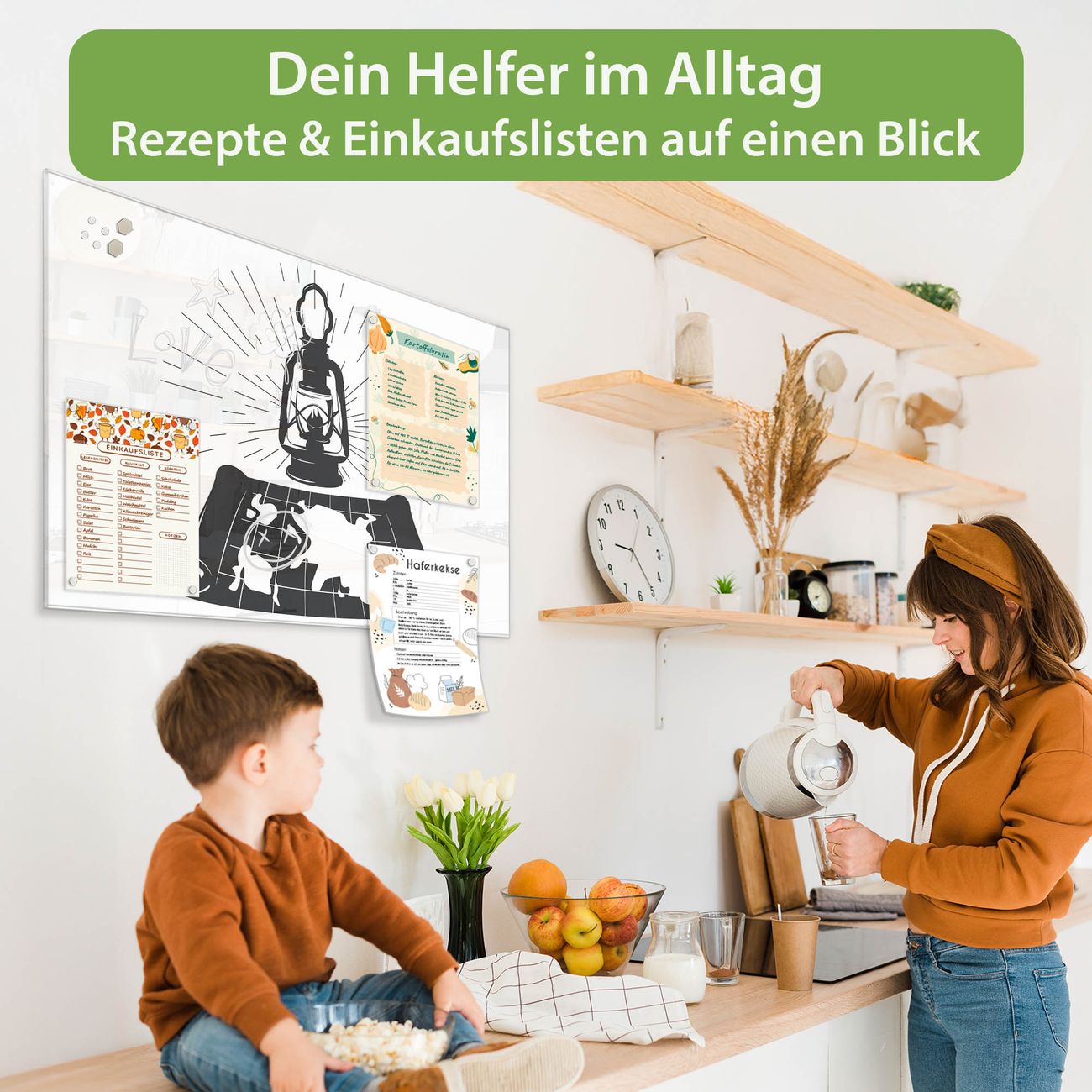 Auf der glatten Glasoberfläche lassen sich Termine, Rezepte oder Notizen ganz einfach mit Kreidestiften festhalten und rückstandslos entfernen. Starke Neodym-Magnete halten Ihre wichtigsten Erinnerungen sicher an Ort und Stelle. So entsteht Ihre ganz persönliche Ideenwand - jeden Tag neu.