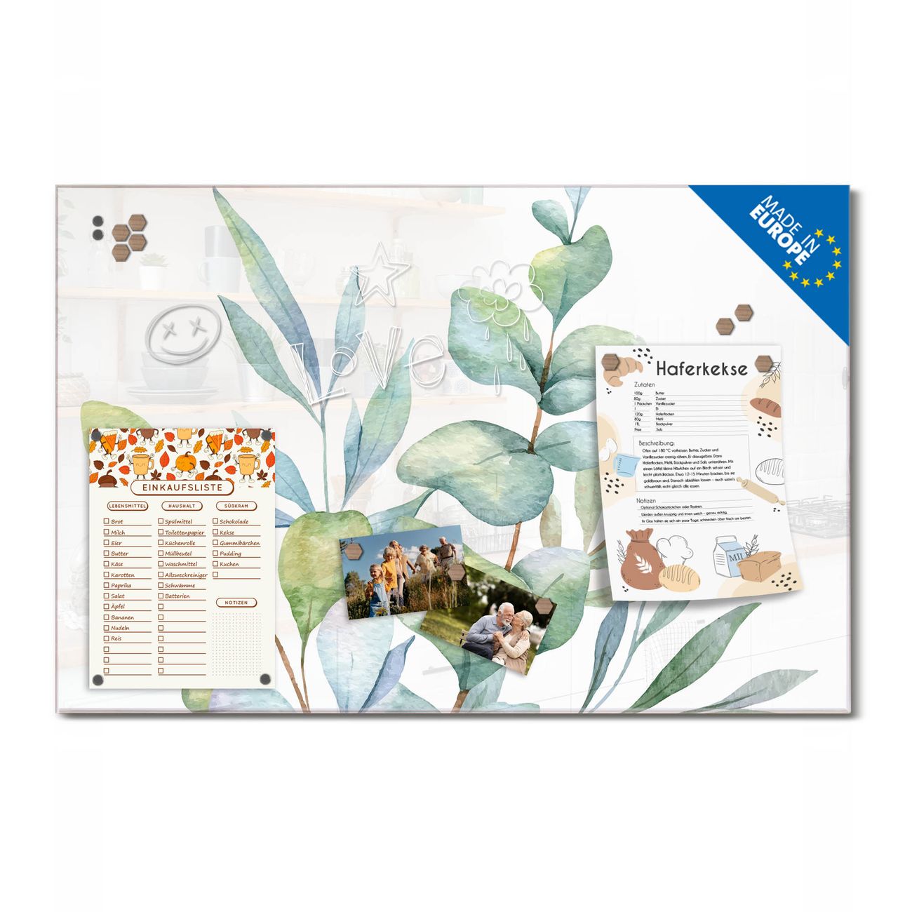 Ein Stück Design, das Ihren Alltag organisiert. Schreiben, heften, inspirieren - alles an einem Ort. Qualität, die man spürt. Montage leicht gemacht. Handwerk mit Herz - veredelt in Sachsen. Einzigartiges Design mit Motiv Motiv Eukalyptus Aquarell Beschreibbare Glasoberfläche, leicht zu reinigen Starke Magnetkraft durch Stahlrückwand Inklusive 4 Neodym-Magneten Flexible Montageoptionen Handveredelt in Sachsen - Qualität, die bleibt