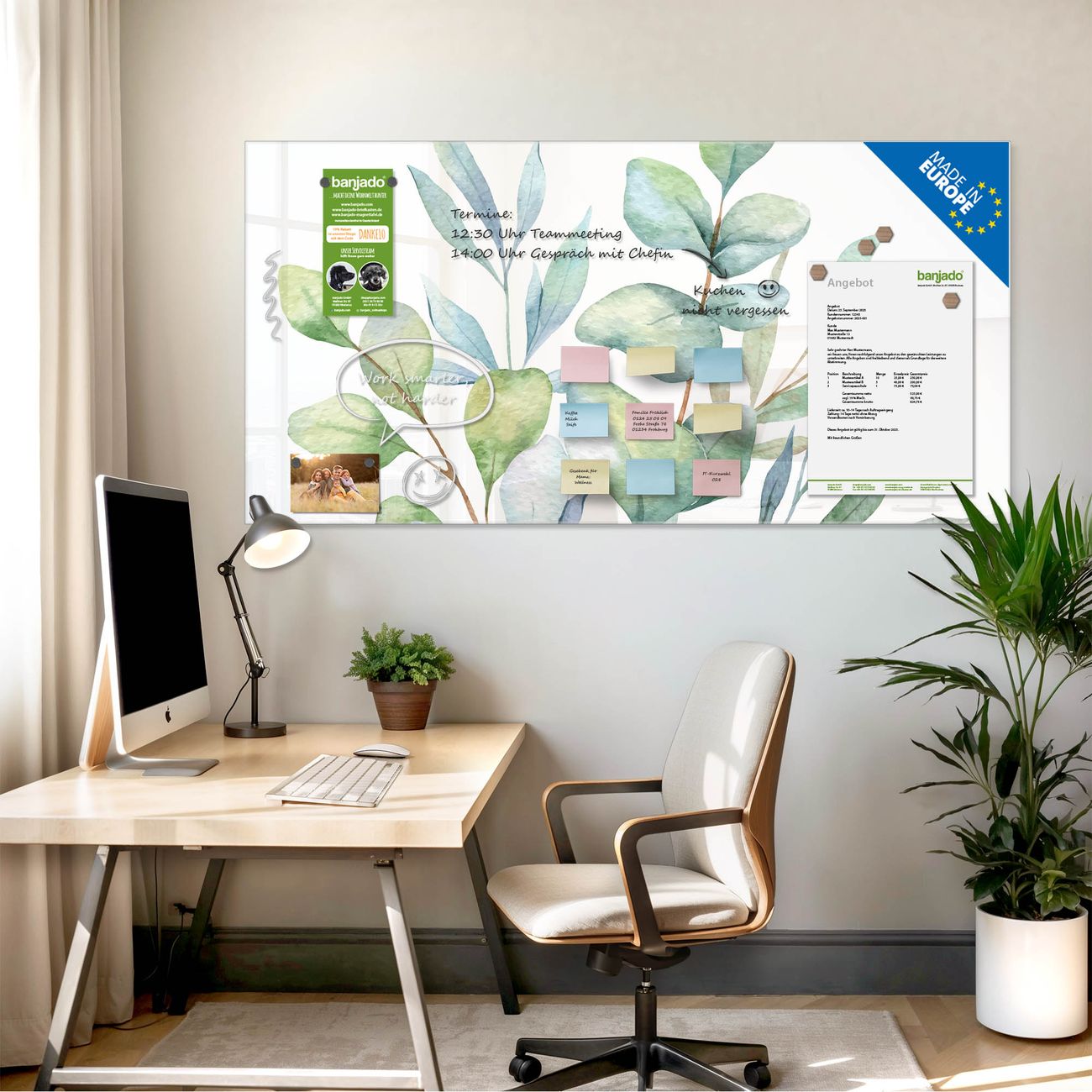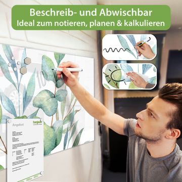 Die banjado Glas Magnettafel mit dem Motiv Motiv Eukalyptus Aquarell verbindet Funktionalität mit Stil. Sie ersetzt das Zettelchaos durch klare Strukturen und bringt dabei eine warme, natürliche Atmosphäre in Ihr Zuhause. Ob im Büro, in der Küche oder im Eingangsbereich - dieses Design-Board zieht Blicke an und sorgt für Ordnung mit Charakter.