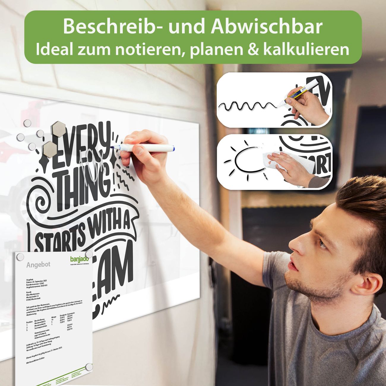 Jede Glas Magnettafel wird in unserer Werkstatt von Hand gefertigt und sorgfältig geprüft. So erhalten Sie ein echtes Qualitätsprodukt, das Funktion und Ästhetik perfekt vereint.?? Warum banjado?