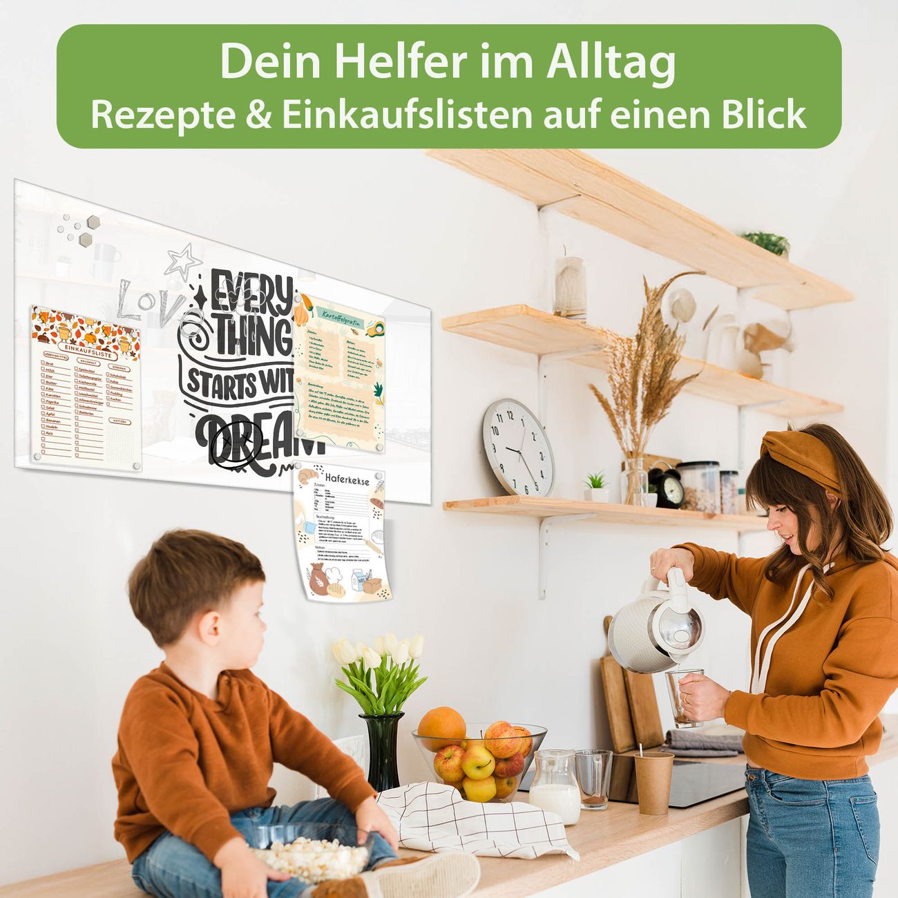 Auf der glatten Glasoberfläche lassen sich Termine, Rezepte oder Notizen ganz einfach mit Kreidestiften festhalten und rückstandslos entfernen. Starke Neodym-Magnete halten Ihre wichtigsten Erinnerungen sicher an Ort und Stelle. So entsteht Ihre ganz persönliche Ideenwand - jeden Tag neu.