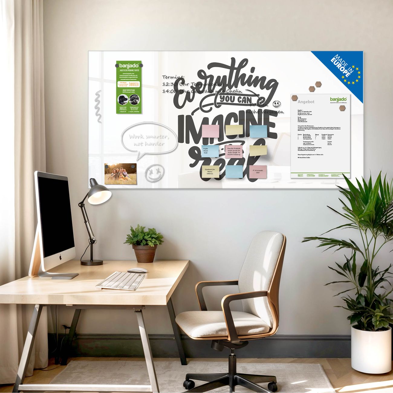 Jede Glas Magnettafel wird in unserer Werkstatt von Hand gefertigt und sorgfältig geprüft. So erhalten Sie ein echtes Qualitätsprodukt, das Funktion und Ästhetik perfekt vereint.?? Warum banjado?