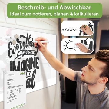 Auf der glatten Glasoberfläche lassen sich Termine, Rezepte oder Notizen ganz einfach mit Kreidestiften festhalten und rückstandslos entfernen. Starke Neodym-Magnete halten Ihre wichtigsten Erinnerungen sicher an Ort und Stelle. So entsteht Ihre ganz persönliche Ideenwand - jeden Tag neu.