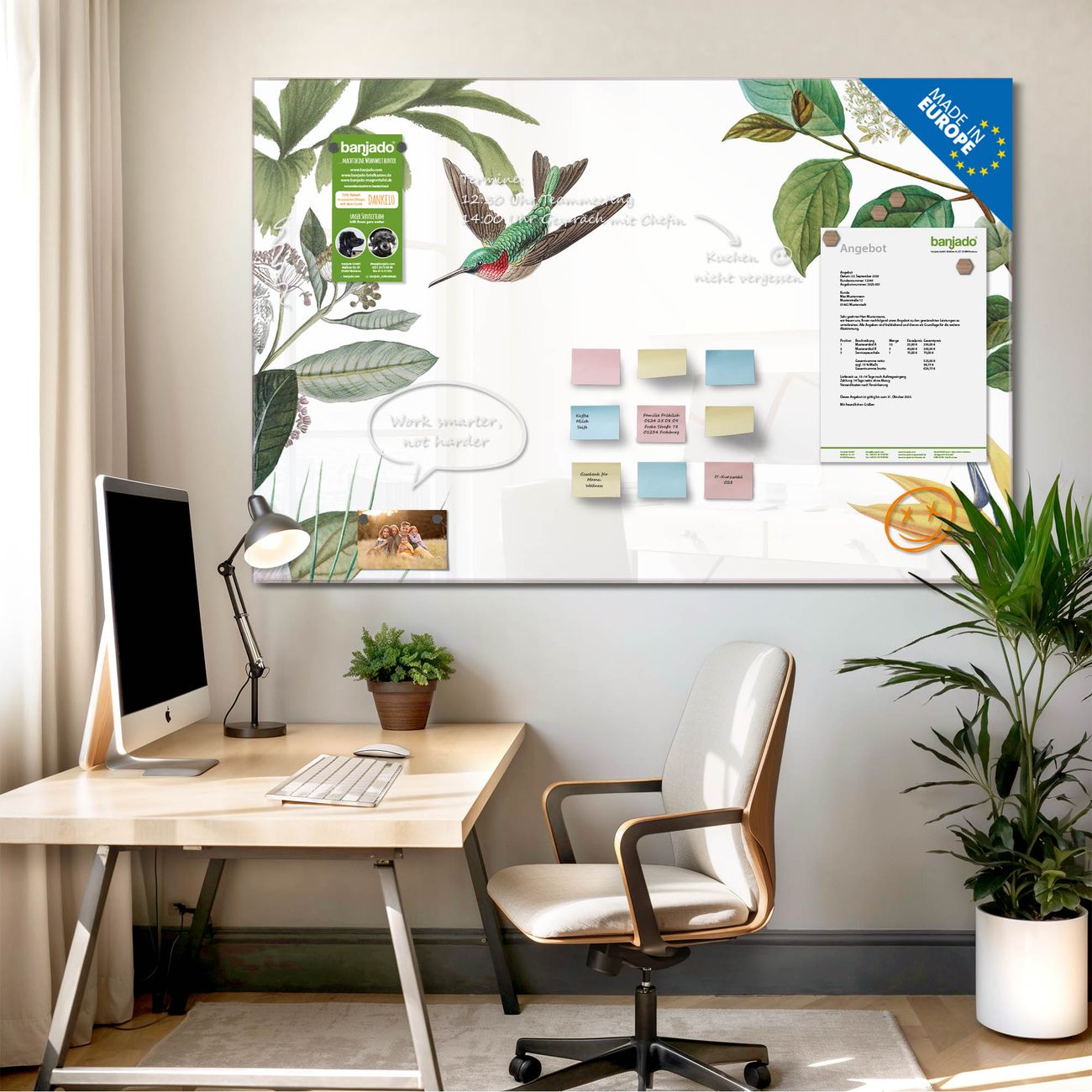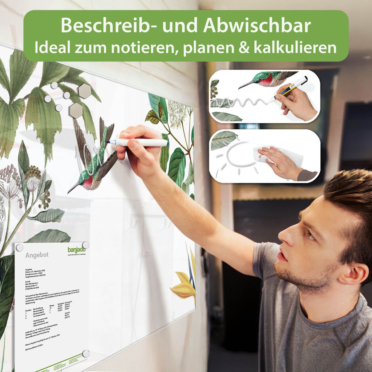 Jede Glas Magnettafel wird in unserer Werkstatt von Hand gefertigt und sorgfältig geprüft. So erhalten Sie ein echtes Qualitätsprodukt, das Funktion und Ästhetik perfekt vereint.?? Warum banjado?