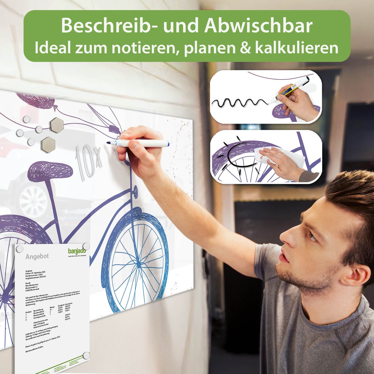 Bitte beachten Sie, dass ausschliessliche spezielle Magnete an der Glastafel haften. Wir empfehlen banjado Neodym Magnete, diese sind durch uns auf Wirksamkeit geprüft.