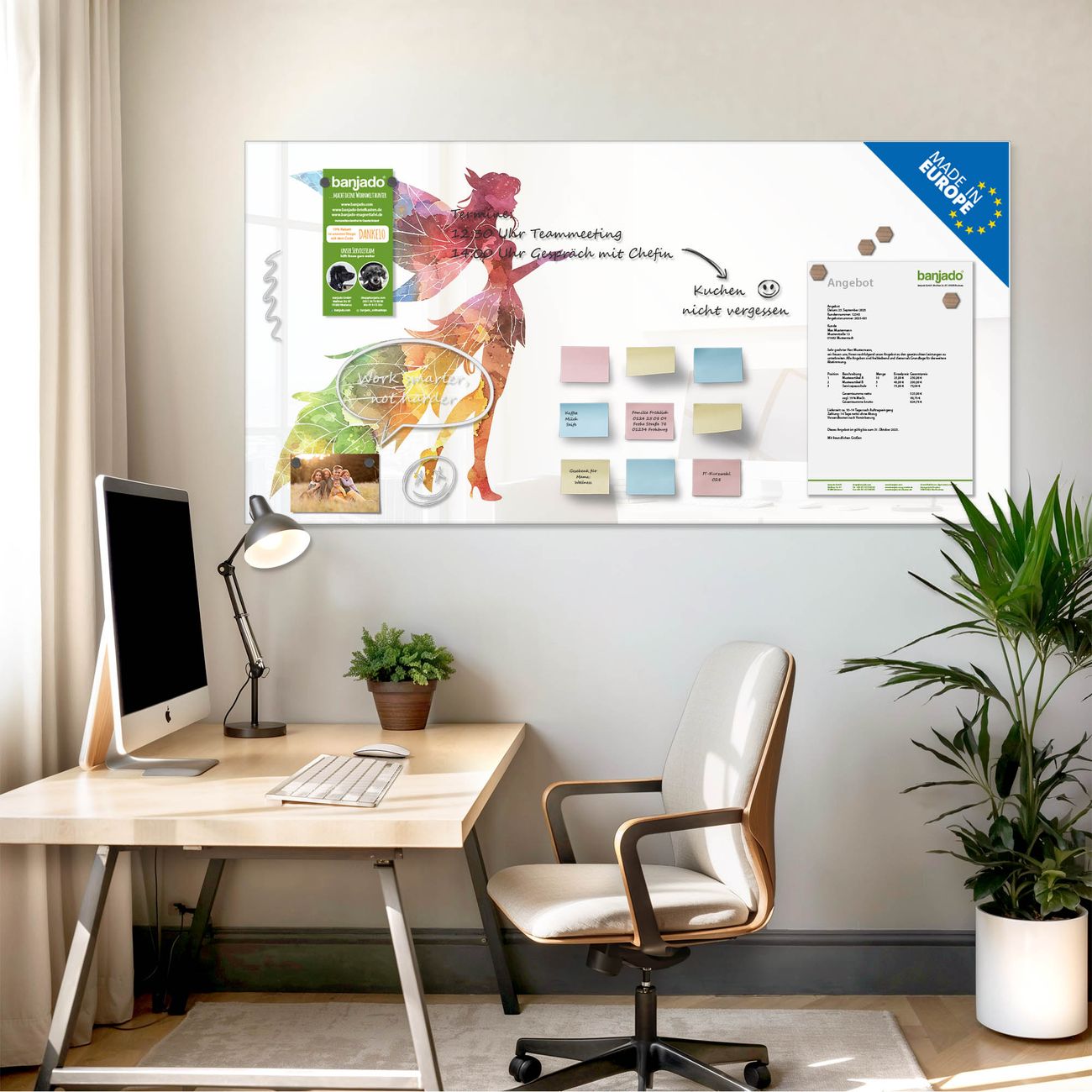 Jede Glas Magnettafel wird in unserer Werkstatt von Hand gefertigt und sorgfältig geprüft. So erhalten Sie ein echtes Qualitätsprodukt, das Funktion und Ästhetik perfekt vereint.?? Warum banjado?
